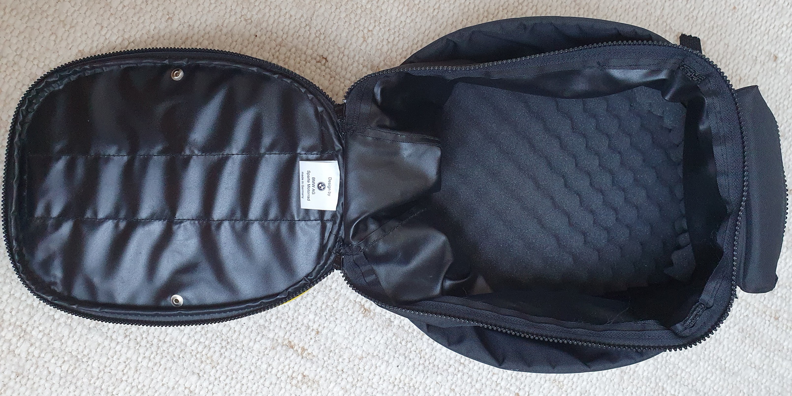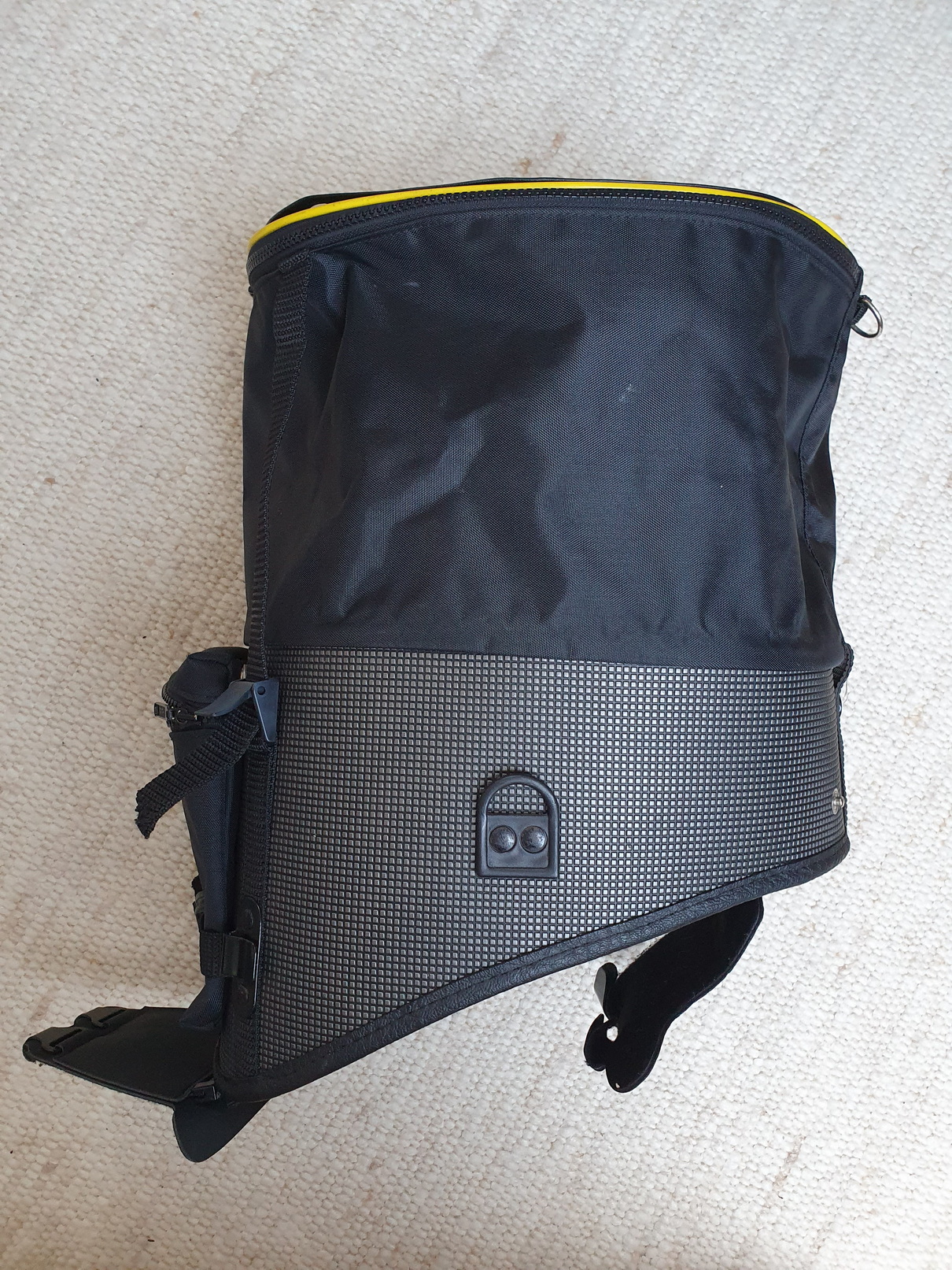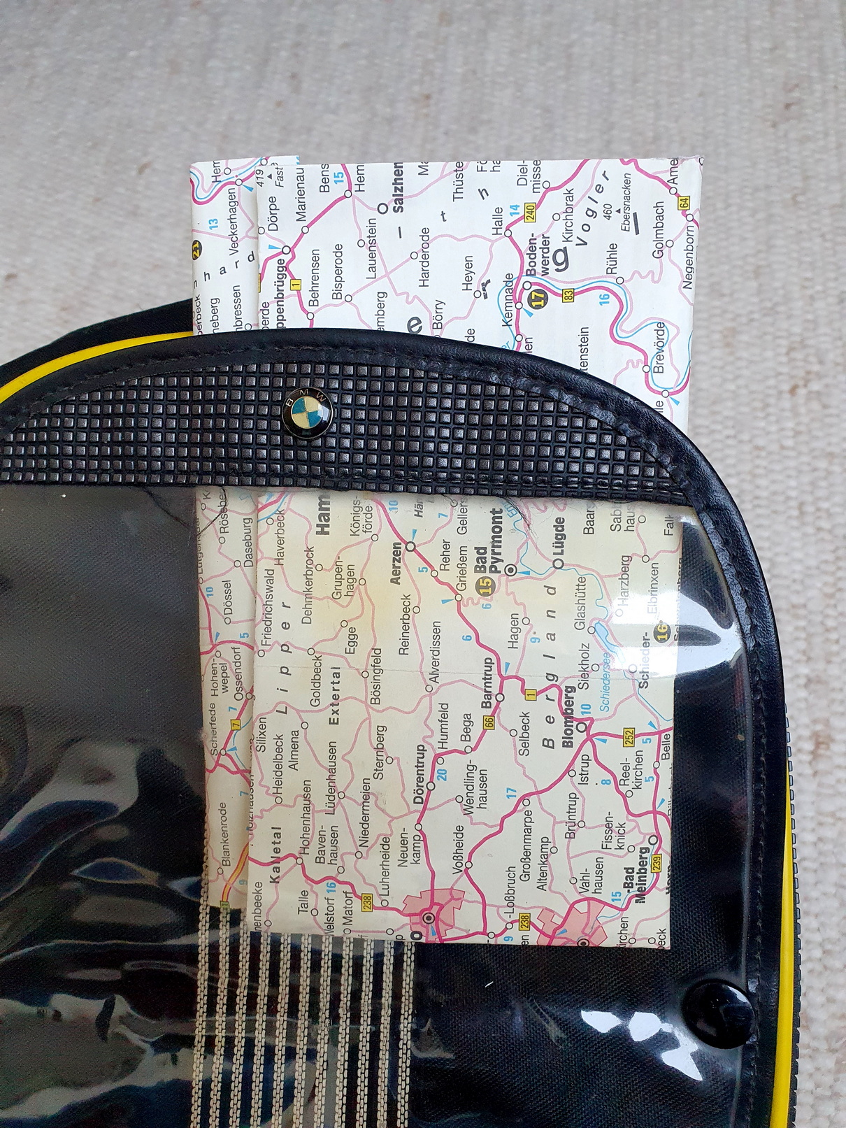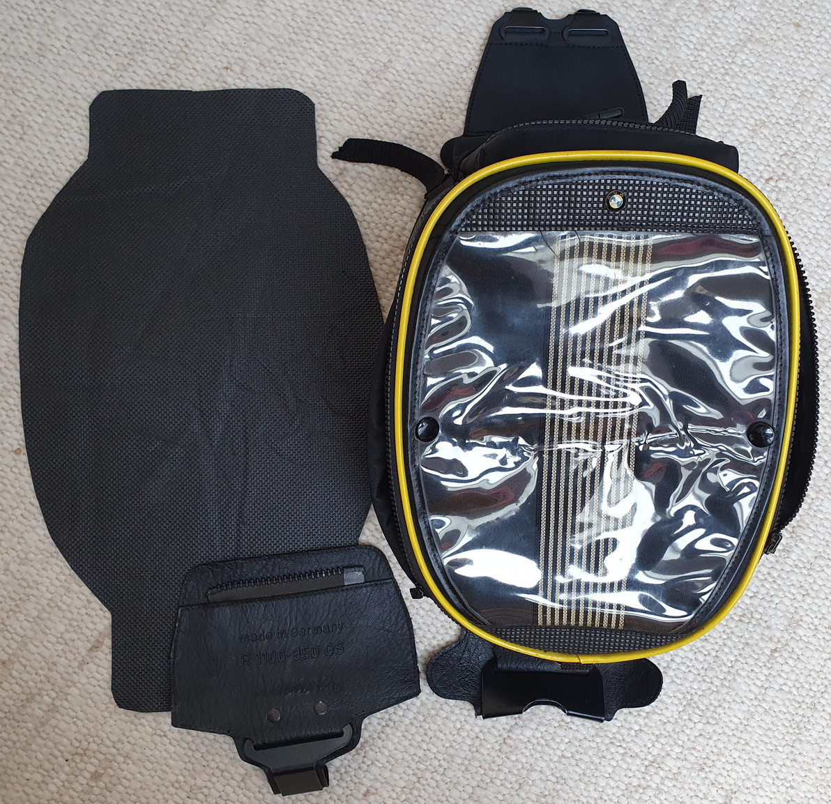 Sehr gepflegter, „mackenfreier“ Tankrucksack original BMW mit kompletter „Montur“ zur Anbringung an Modell 850, 1100 und 1150 GS. Zustand wirklich fast (!) neuwertig, Kartenfolie nicht gerissen oder vergilbt, noch sehr flexibel und nicht brüchig. Innen Schaumstoffpolstereinlage, für unten drunter extra zugeschnittene Moosgummiunterlage zur Lackschonung. Lässt sich per Reissverschluss im montierten Zustand einfach abnehmen und wieder anbringen. Das Hauptfach ist weit expandierbar und Korpus und Folie dicht.