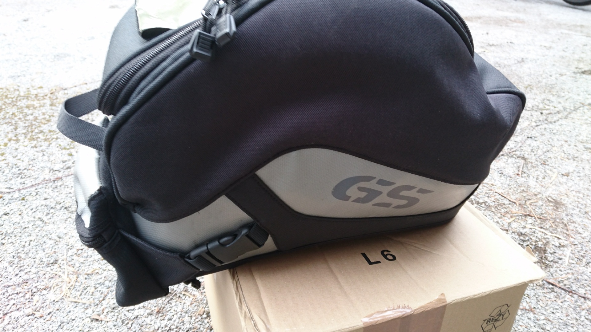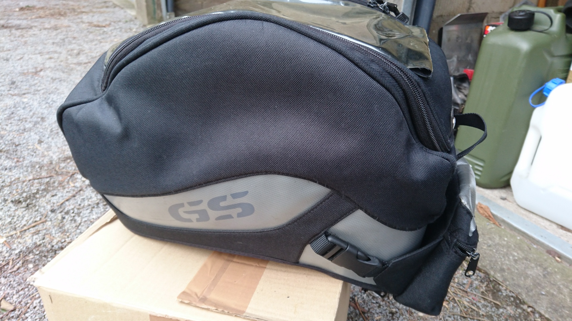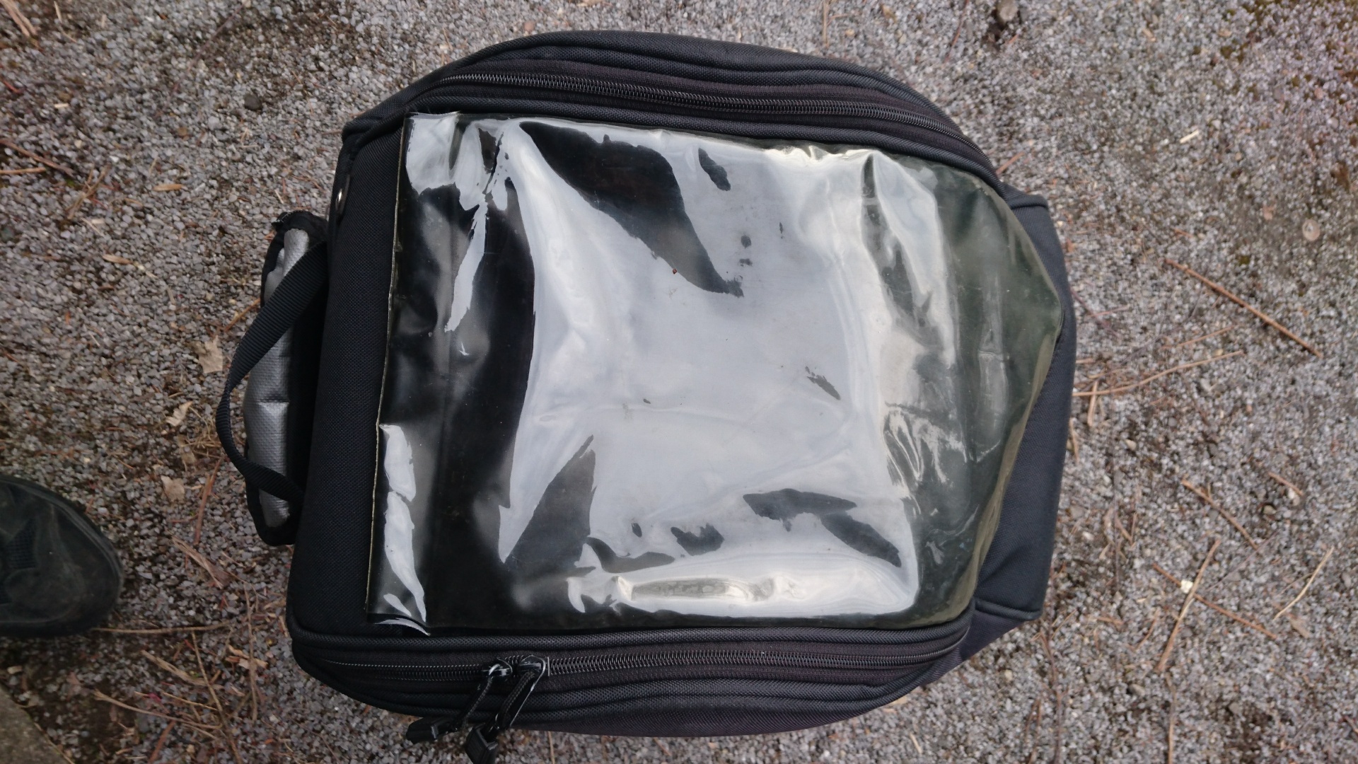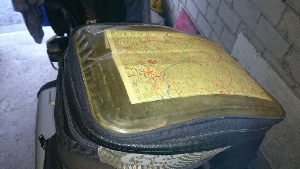 Dazu gebe ich einen nicht mehr so schönen kleinen Tankrucksack, dessen Kartenfach