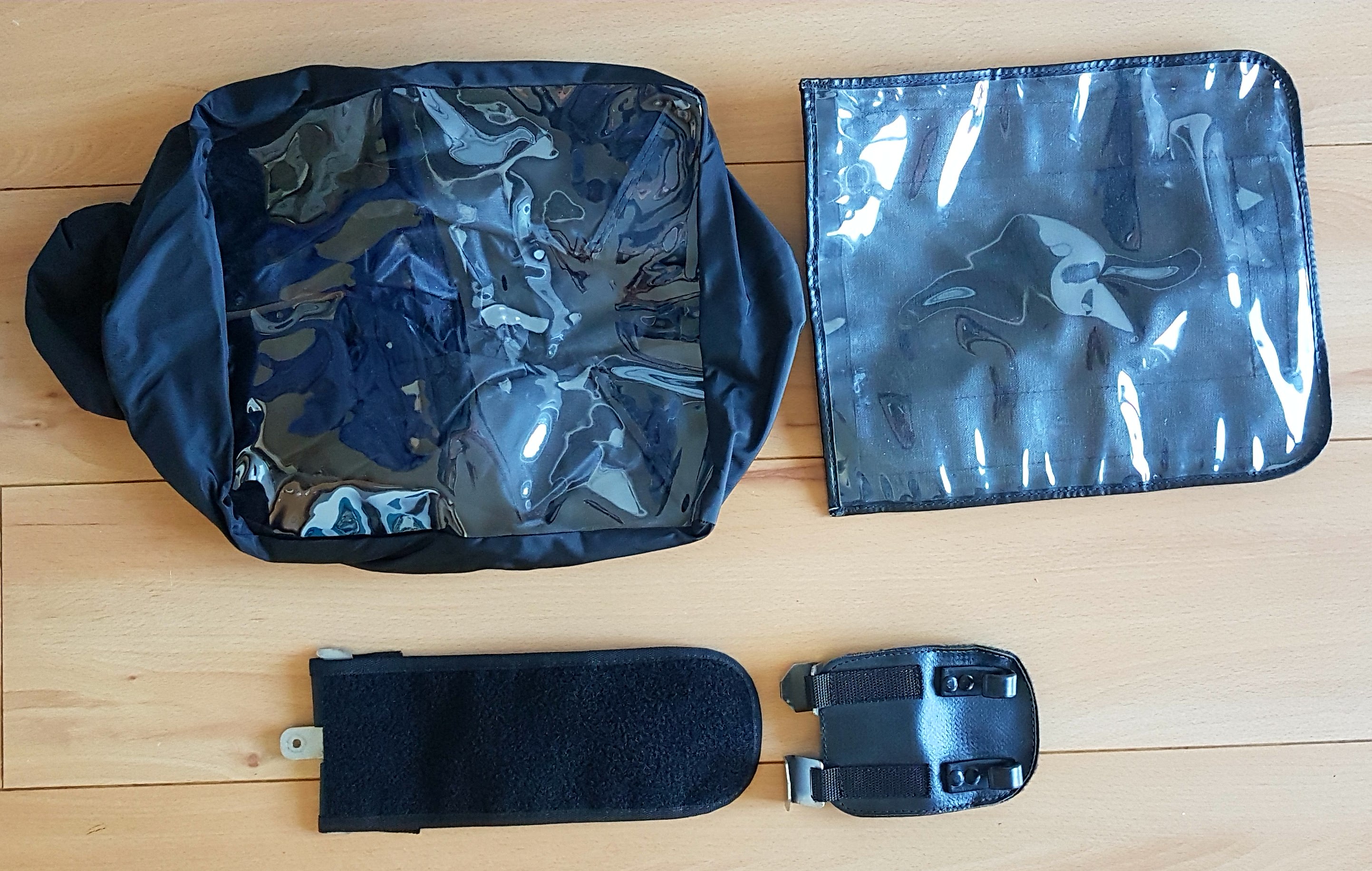 Mit dabei sind die Befestigungen vorne und hinten, das Kartenfach zum Aufkletten und die Regenhaube.