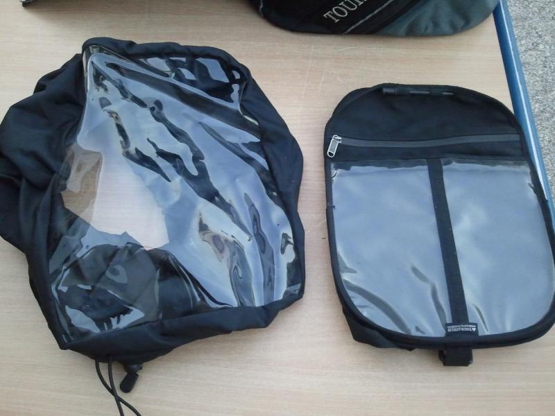 1 Tankrucksack Touratech mit Regenhaube und zweiter Kartentasche, die anstelle der normalen Kartentasche montiert werden kann. Die zweite Kartentasche hat zwei Klarsichtfächer, für Mobiltelefon, PDA/Palm, GPS oder andere Utensilien. Auf der Rückseite gibt es eine kleine, mit Klett verschließbare Öffnung, durch die sich Anschlusskabel für PDAs oder GPS legen lassen. Zum Lieferumfang gehört auch ein Stylus-Stift.