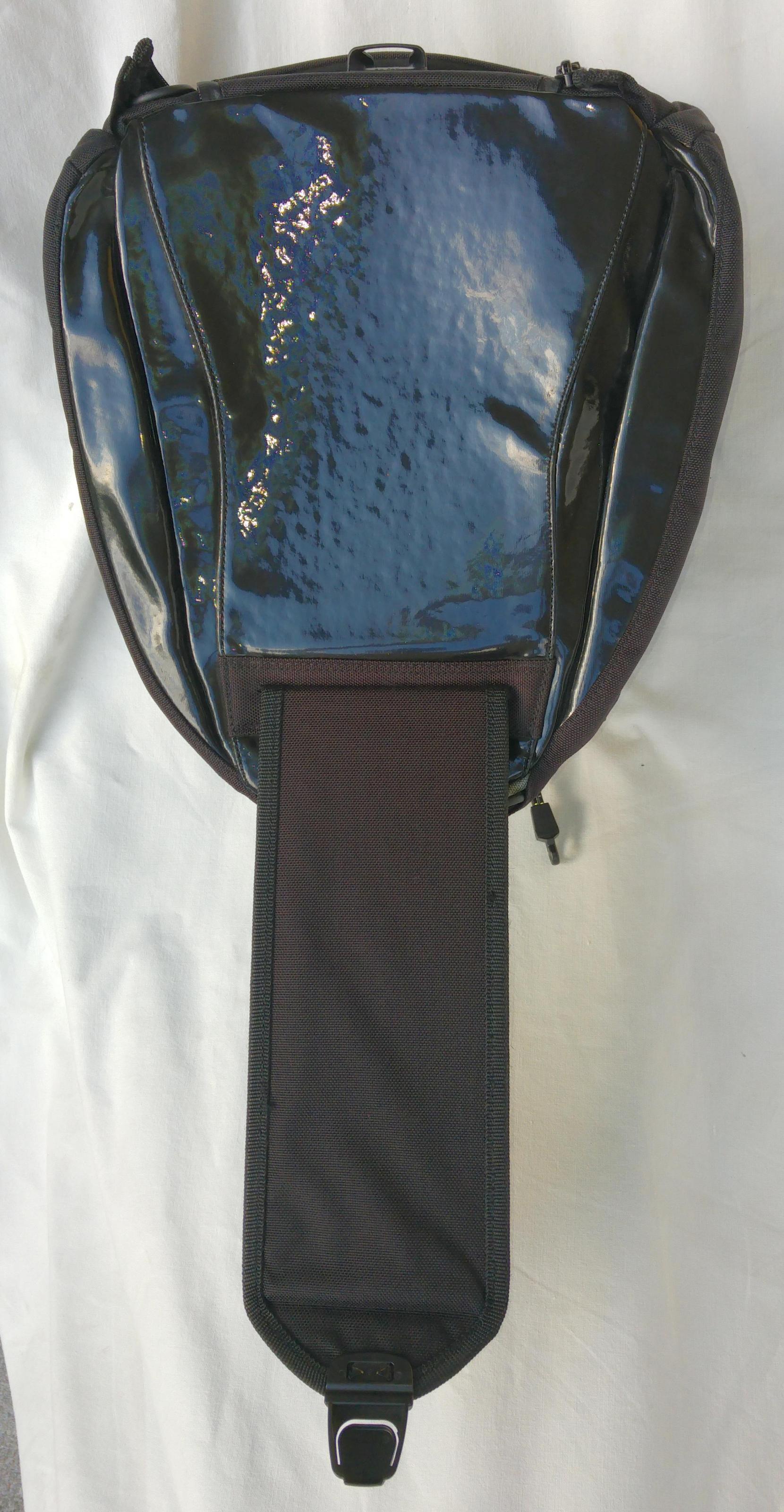Schnalle vorne am Tankrucksack befestigt wird.