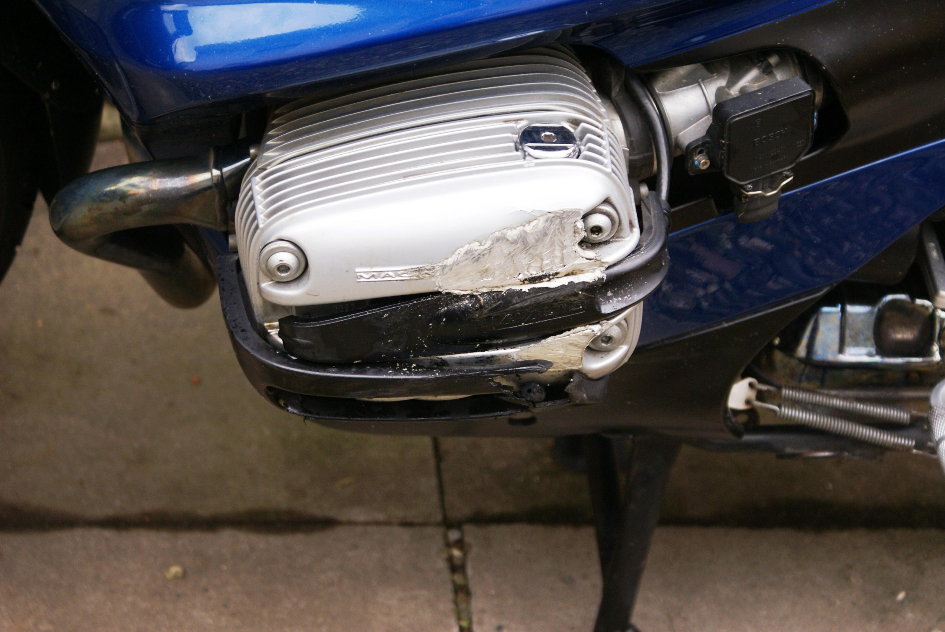 Das war nur ein kleiner Rutscher 500m vor der Haustür, darum hat meine GS den Zylinderschutz von Touratech. Den habe ich gewählt weil er sich zusätzlich oben am Rahmen abstützt.