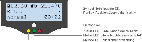 (u.a. gelb zur Eiswarnung ab <5°C, rot für Über-/Unterspannungsalarm,..)