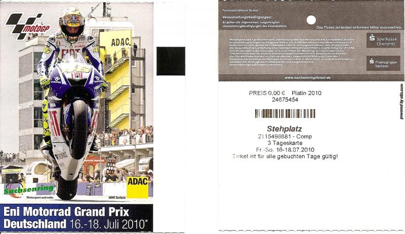 Verkaufe ein Platin Stehplatzticket für den Motorrad Grand Prix von Deutschland auf dem Sachsenring vom 16.-18.Juli 2010. Das Ticket gilt für alle drei Tage.