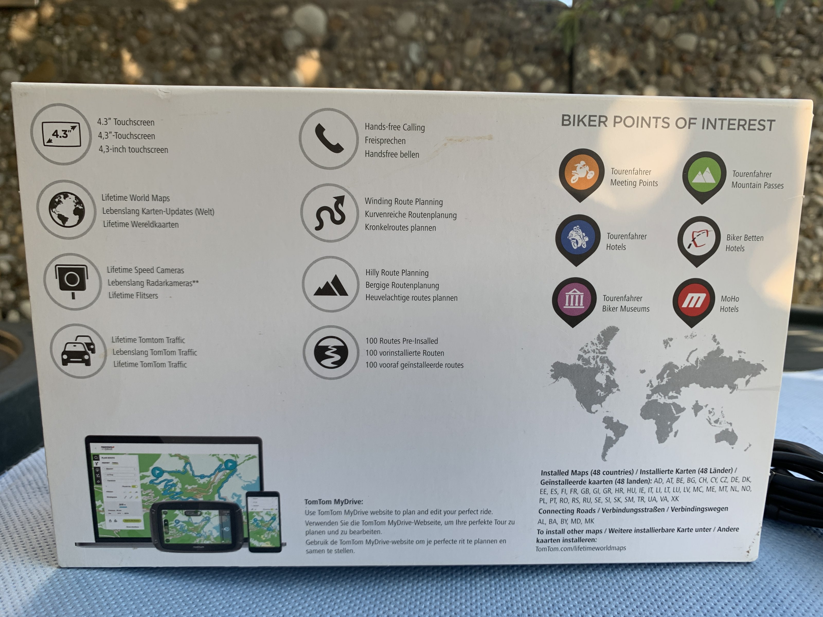 Der 450er verfügt über Bluetooth, verbindet sich problemlos mit dem Headset und das beste, er hat kostenlose weltweite Karte.