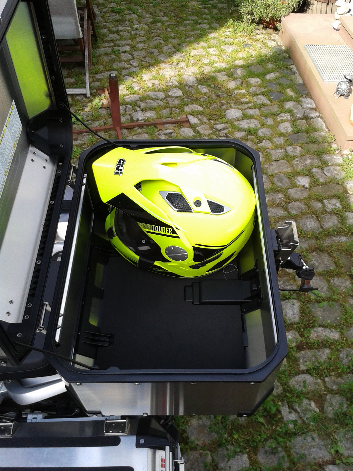 Sooooooo, es hat mir keine Ruhe gelassen! Jetzt habe ich schon ein Topcase, aber da geht nur ein Helm rein, und während wir letzte Woche Samstag durch die Frankfurter Innenstadt bummeln und ich meinen Helm dabei rumtrage während der Helm der Liebsten im Topcase ist, ist die Entscheidung gefallen - das große 58er muss her! Und das allerbeste: den rechten Seitenkoffer kriegt man immer noch auf, nur links ist der Koffer zu nah am Fahrzeug bzw. das Topase über dem Deckel, und man kann ihn nicht mehr vollständig nach oben klappen. Bin happy jetzt :)