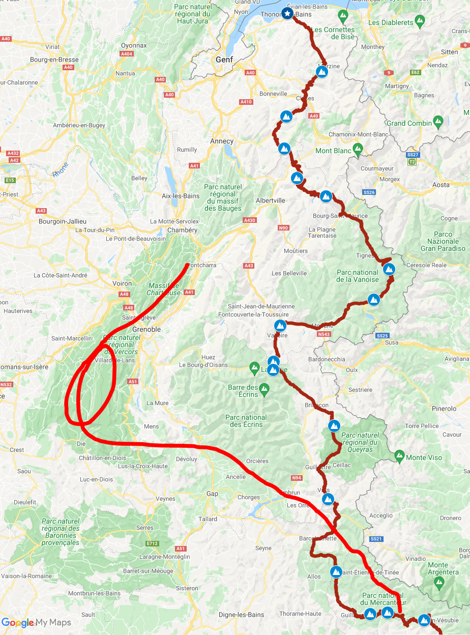 Waren 5 Tage unterwegs. Für die komplette RDGA solltest du imho 5-6 Tage einplanen bis Nizza (oder wo auch immer …). Und die für Rückfahrt kannste theoretisch locker auch soviel Tage verplanen … Im alpinen Gelände auf Pässen / Bergstraßen ist eine Tagesetappe von 300 km schon sportlich …