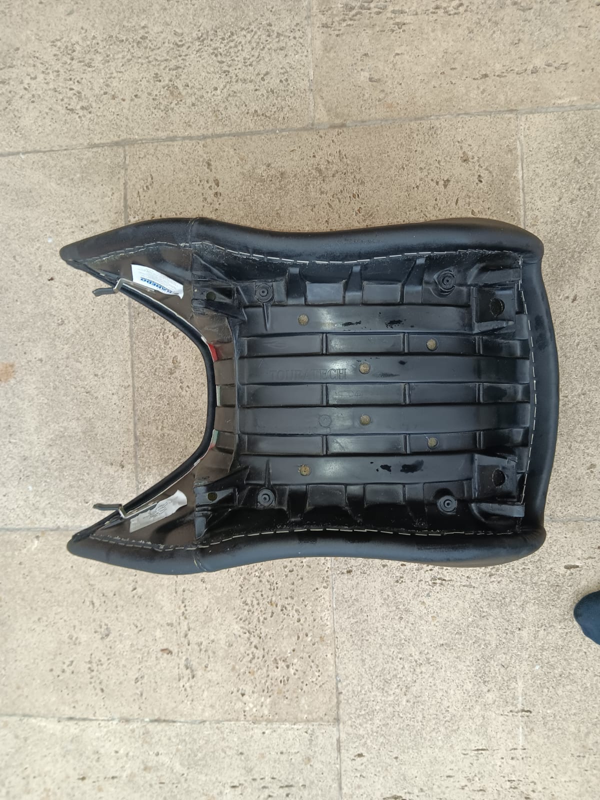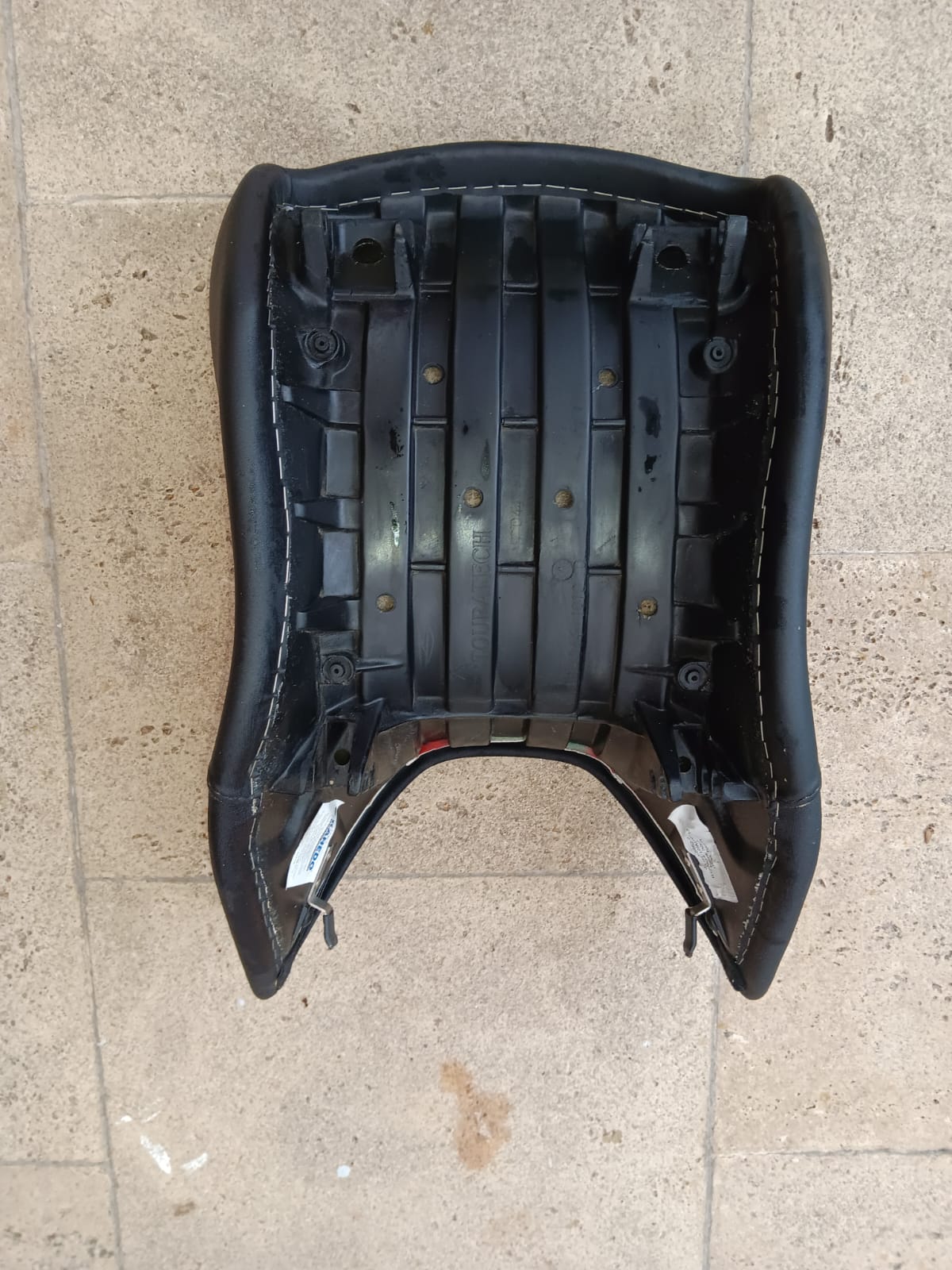 Oberfläche und Polster in sehr gutem Zustand, auf der Unterseite hat sich etwas Saharastaub auf den Kleberesten des Bezugs festgesetzt. Ist die Sitzbank montiert, sieht man davon jedoch natürlich nichts mehr. Ansonsten einwandfrei.