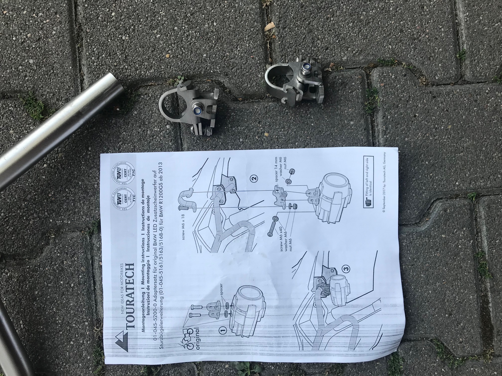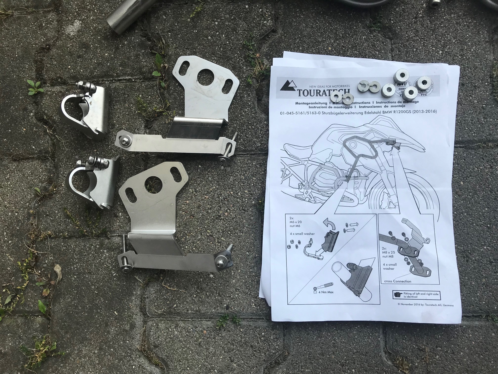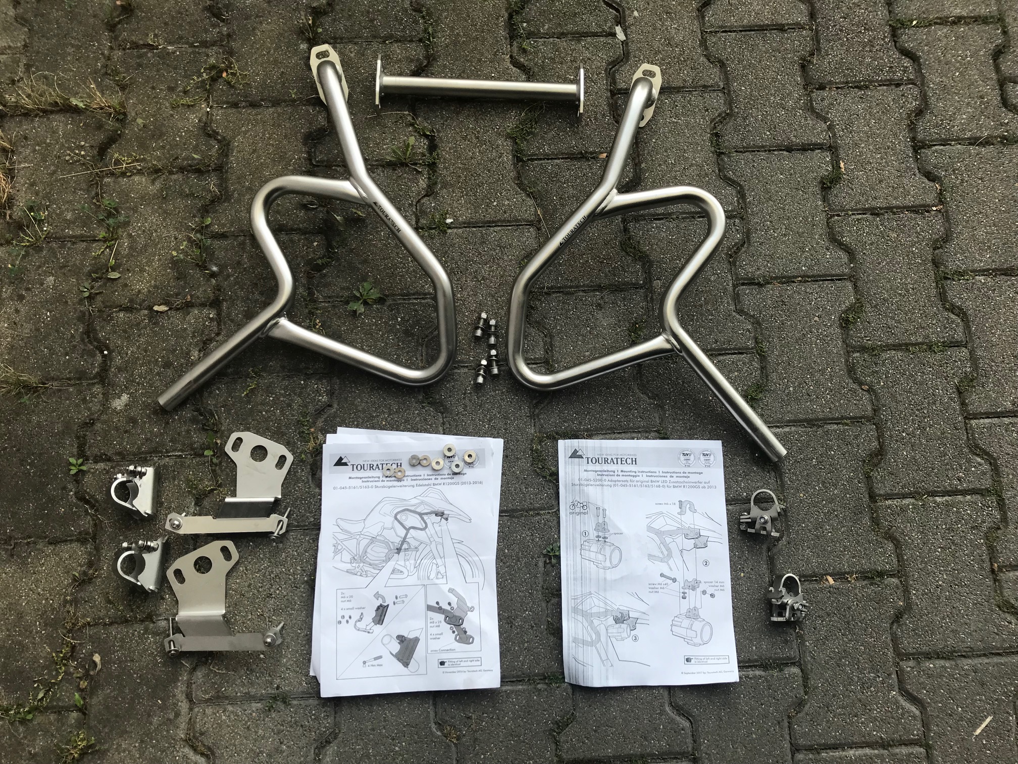 Zum Verkauf kommen Touratech Sturzbügelerweiterungen aus Edelstahl und die dazugehörigen Adapter für die Original BMW Zusatzscheinwerfer.