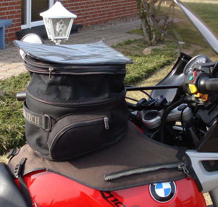 Das ganze besteht aus einer Mahnetplatte, auf der das Kartenfach befestigt werden kann, wenn man ohne TR eine kleine Spritztour macht. Weiterhin solide Grundplatte mit Tanköffnung und Gurtbefstigung. Zusätzlich 2 große Seitentaschen am Tank mit Reißverschluß zur Grundplatte und Riemenbefestigung am Rahmen. Regenhaube ist dabei.