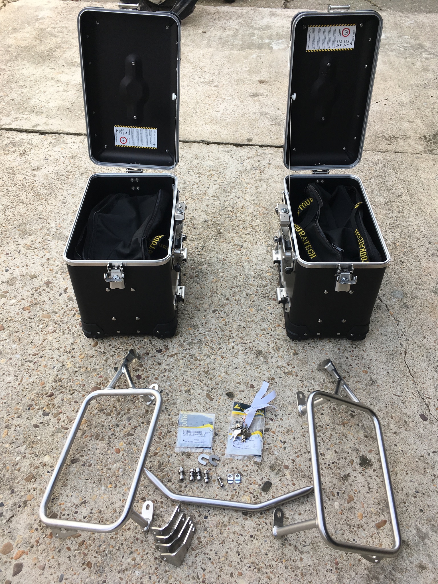 Komplett neu und unbenutzt mit Halterung, Innentaschen und Schlössern. Wurden nur einmal montiert um zu schauen ob Sie passen.