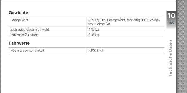 Mit 90% Tankvolumen und ohne Sonderaustattung . Die Triumph hat fahrfertig mit vollem Tank 261, gehen wir mal von Gleichstand aus