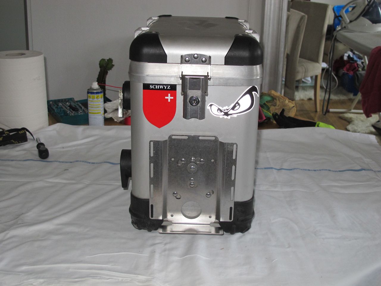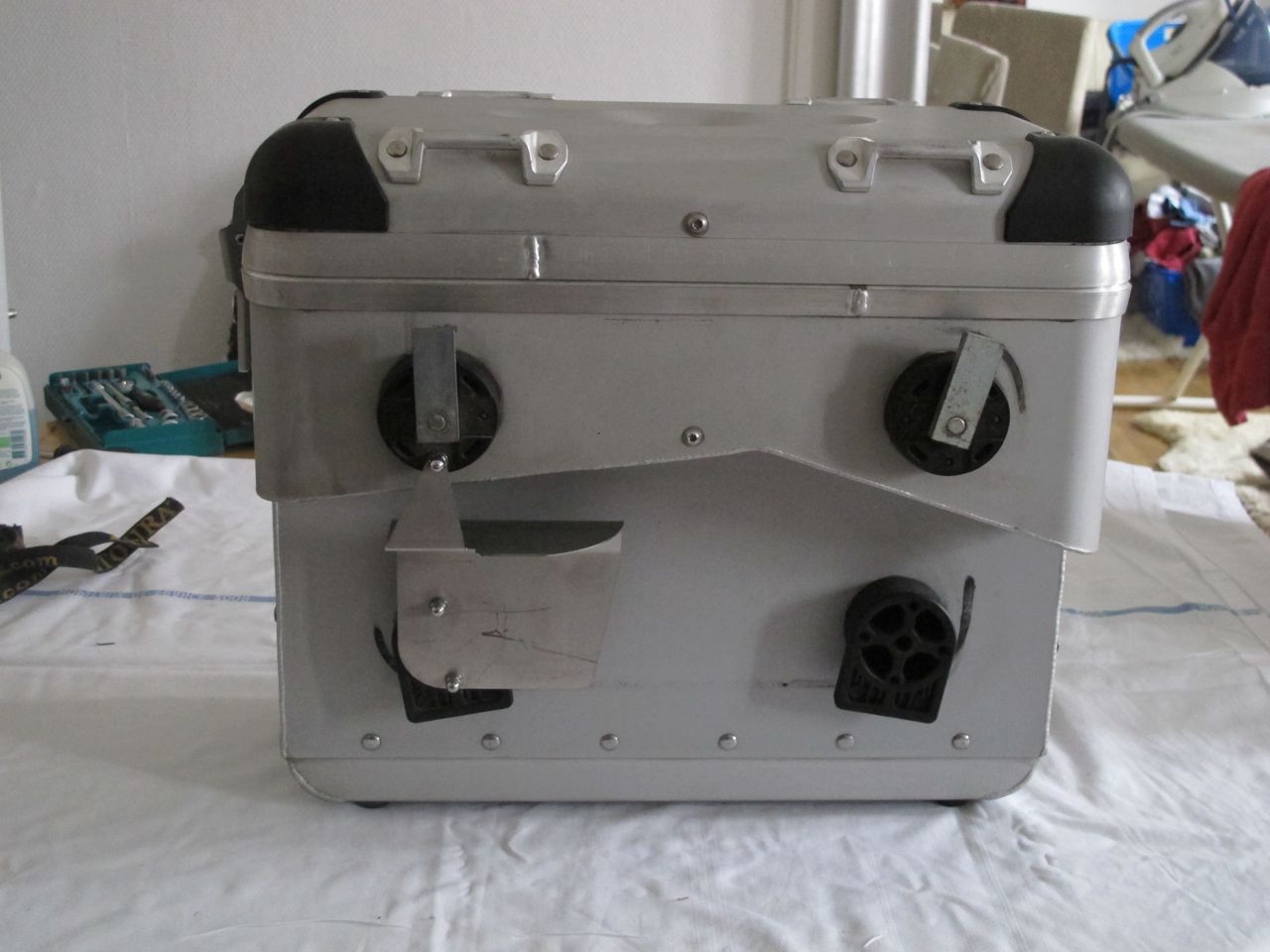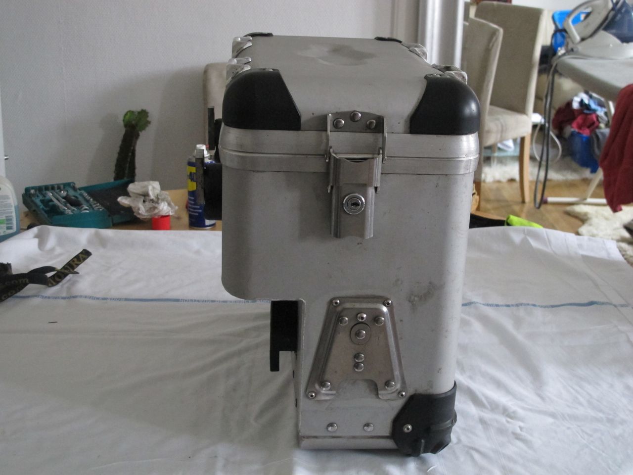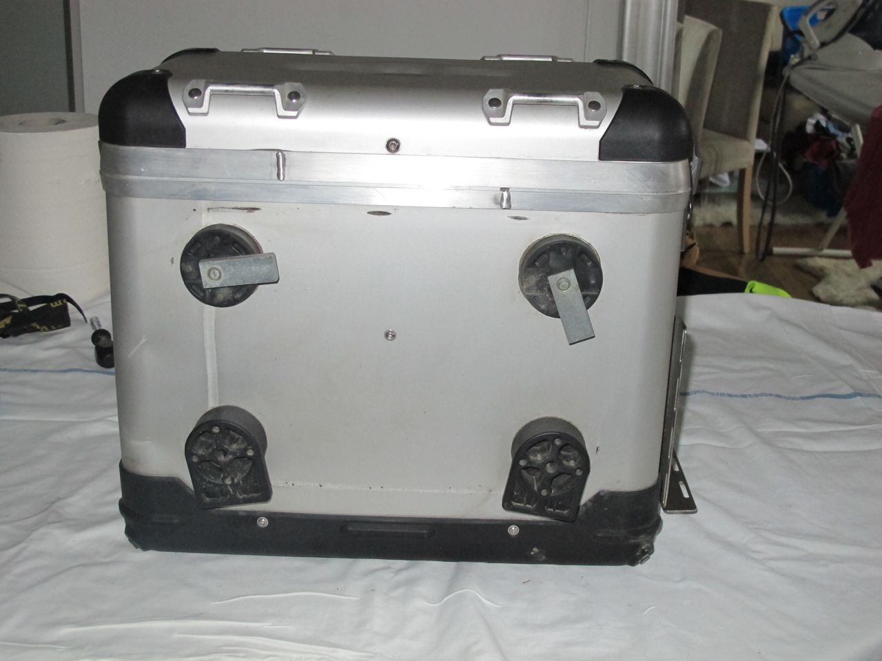 Koffer sind absolut dicht und mit Schloss (4x) ausgestattet, ein Schlüssel passt für alle. Verbaut sind an jedem Koffer vorne und hinten eine Grundplatte. Für hinten gibts den doppelten Flaschenhalter und eine Universalplatte mit Abstützwinkel (2 Befestigungsriemen je Platte).