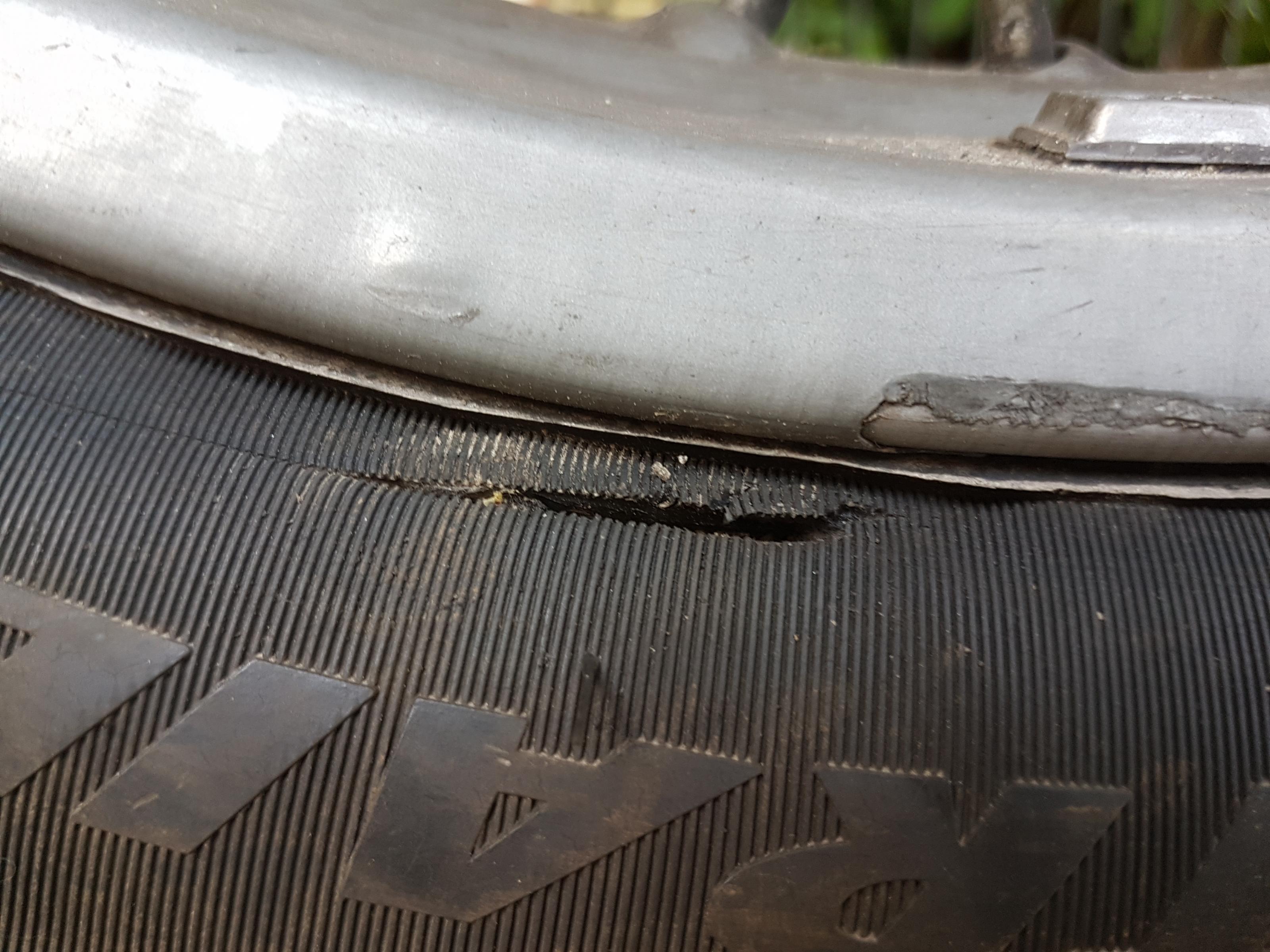 Ich kann es mir auch kaum vorstellen, die Beschädigung beim Montieren zu verursachen. Es würde aber vom Schadensbild so gut passen. Der Schnitt zieht sich von links nach rechts, man sieht das recht gut wenn das Bild vergrößert ist. Beim Fahren kann das eigentlich nur beim Rückwärtsfahren passieren. Bei der Montage ist das in der Richtung, in der normalerweise der Reifen über die Felge gedrückt wird. Die Beschädgiung könnte beim hantieren mit einer einfachen Montagevorrichtung passieren.