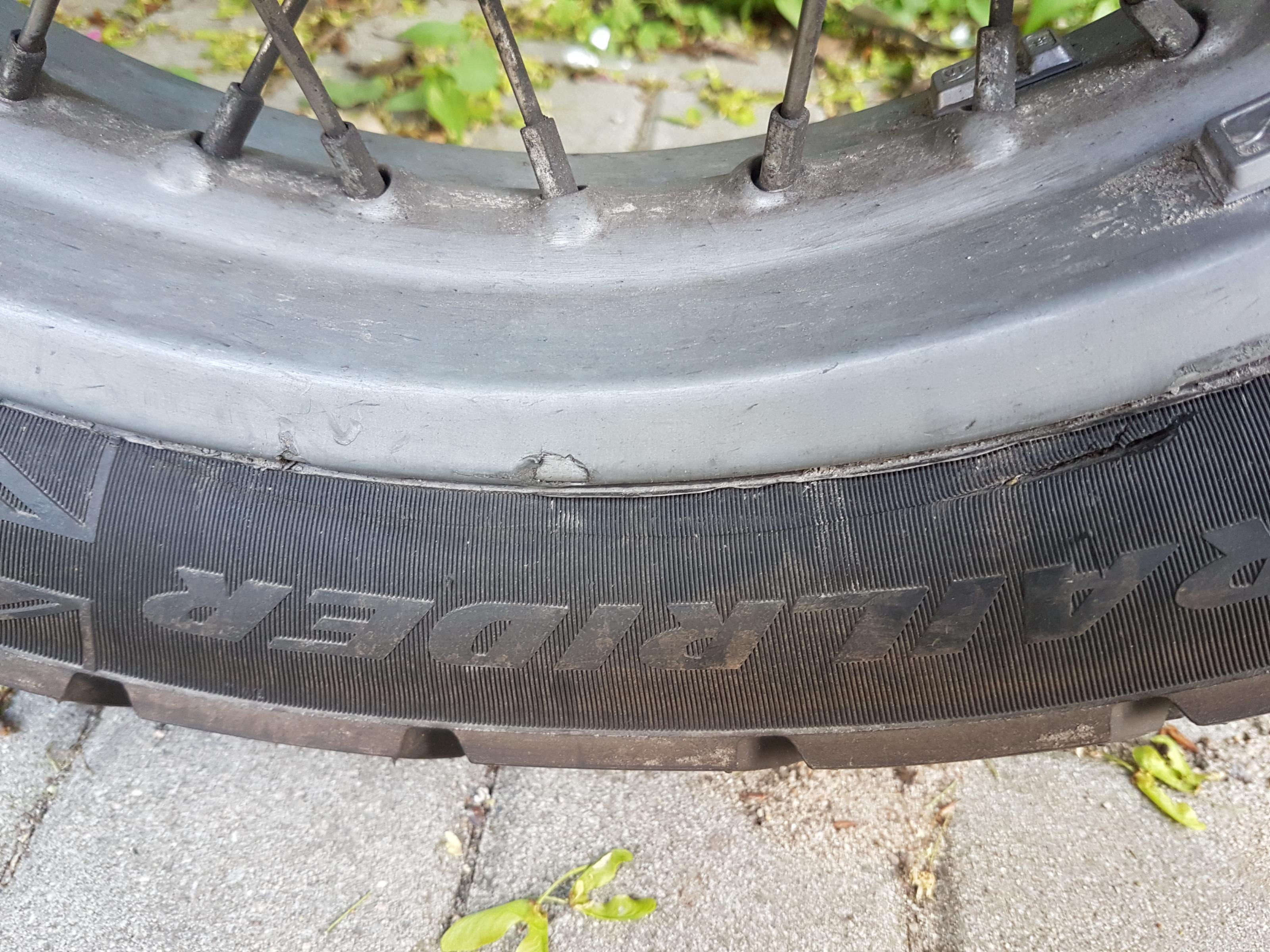 Fragen: Wie lautet die Felgenbezeichnung einer Dakar Standardfelge? Ist die Standardfelge mit Doppelhump versehen oder nicht? Kann der Schaden auf den Bildern daher resultieren, dass der Reifen aufgrund möglicherweise fehlenden Doppelhumps in die Felge gerutscht und dort kaputt gegangen ist?
