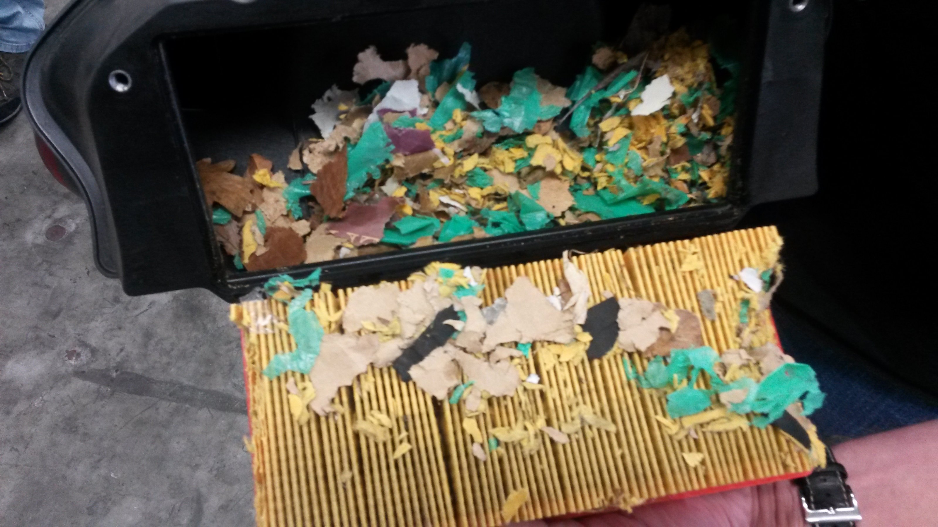 So wie es ausschaut, ist der Luftfilter an sich noch weitestgehend intakt. Das Rattennest mit einem Staubsauger aussaugen.