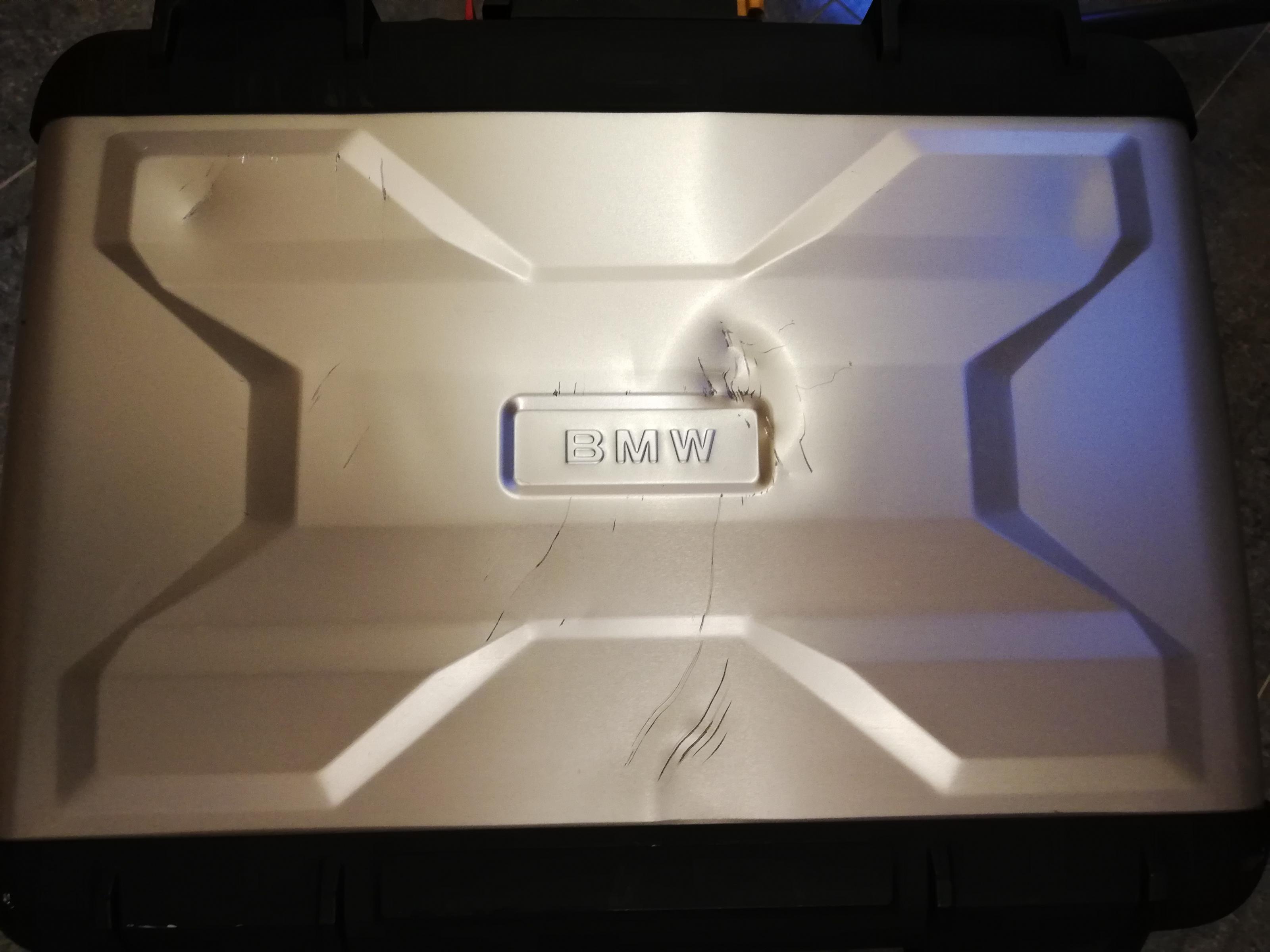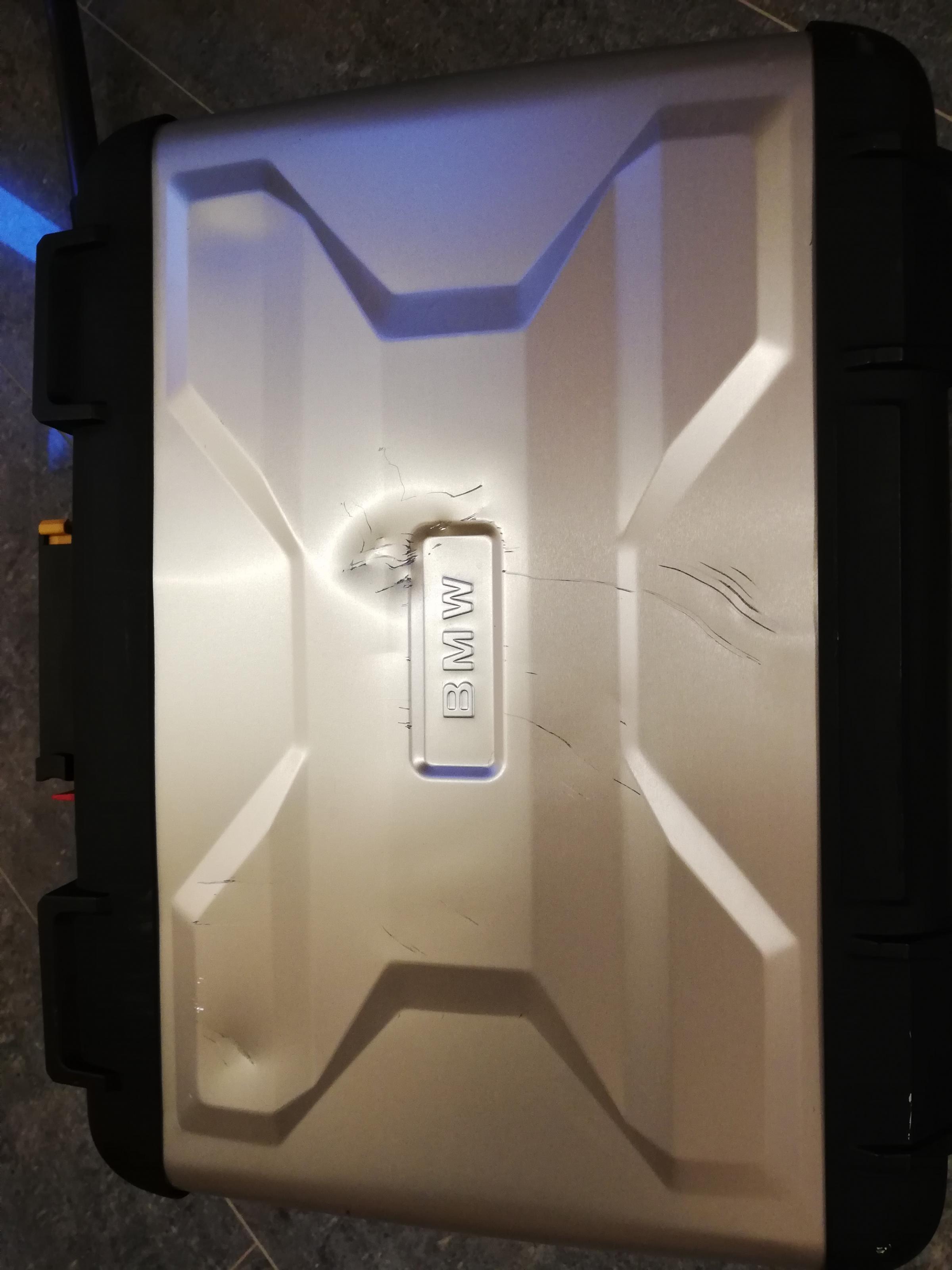 Für mich sieht das aber eher so aus, als wäre die Maschine (R 1200 GS) umgefallen auf den Koffer und darunter war z. B. ein Stein oder ähnliches. Oder sieht er auch so aus, wenn man ihn während der Fahrt verliert?