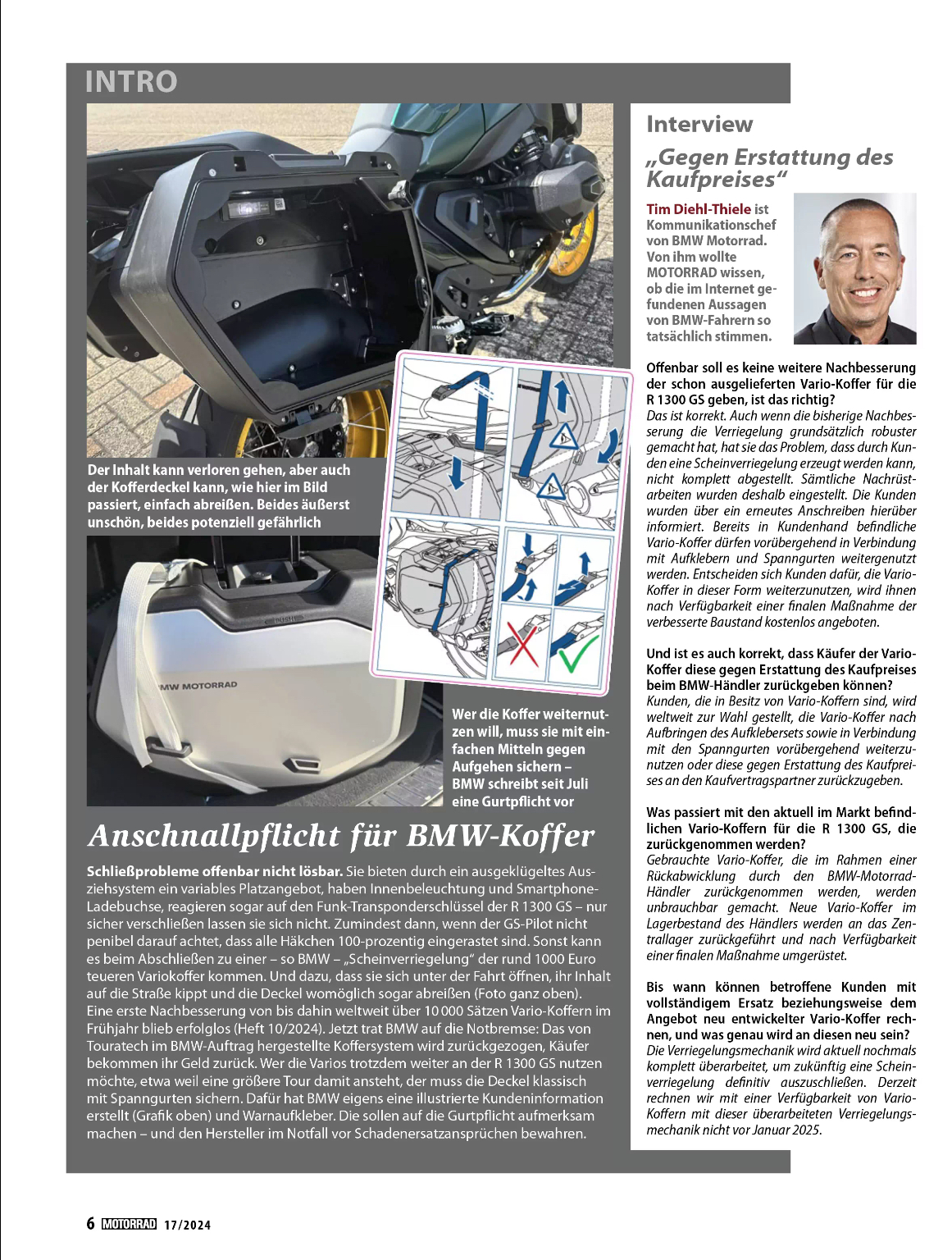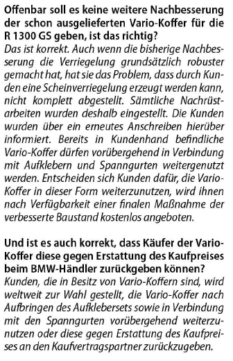 hier der ganze Bericht.In der Ausgabe der Zeitschrift Motorrad, die morgen in Papierform erscheint hat BMW zu der Kofferthematik Stellung bezogen wie damit umgegangen wird. Das kann man dan seinem Händler unter die Nase reiben…