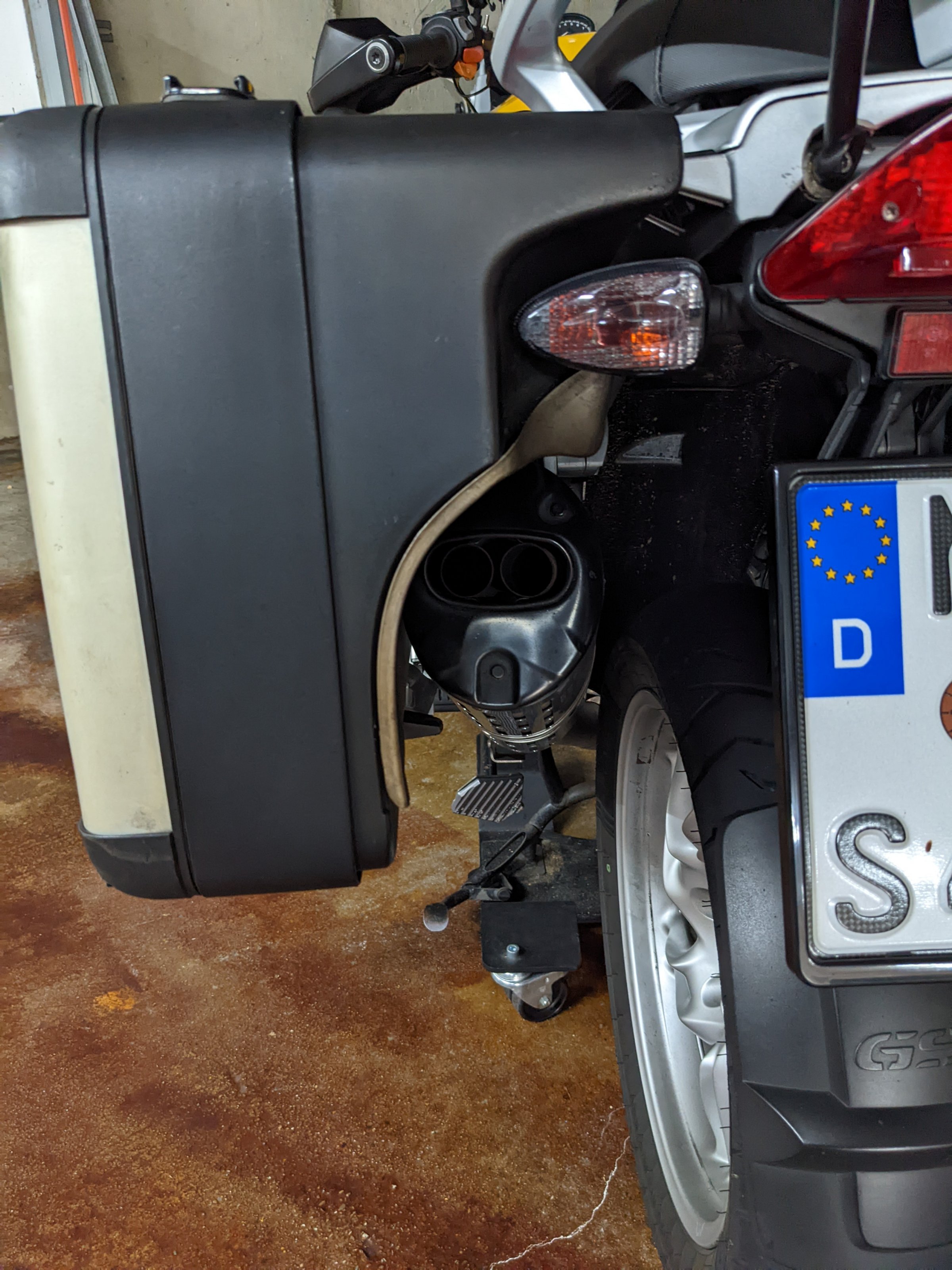 Der linke Koffer hängt soweit normal und auch gerade, jedoch gibt es keinen Abstand zwischen dem linken Blinker und dem Koffer. Das heißt der Blinker liegt permanent am Koffer an (also auf "Spannung") und nicht so wie beim rechten (dieser kann frei "schwingen"). Zudem sagt er das mein Hitzeschutzblech auch verfärbt ist weil es so aussieht, als würde der Abgasstrahl auf das Blech des Koffers treffen und nicht gerade rauslaufen. Auf den Bildern sieht man das jetzt nicht sooo gut, aber wenn man persönlich davor steht sieht das schon so aus.
