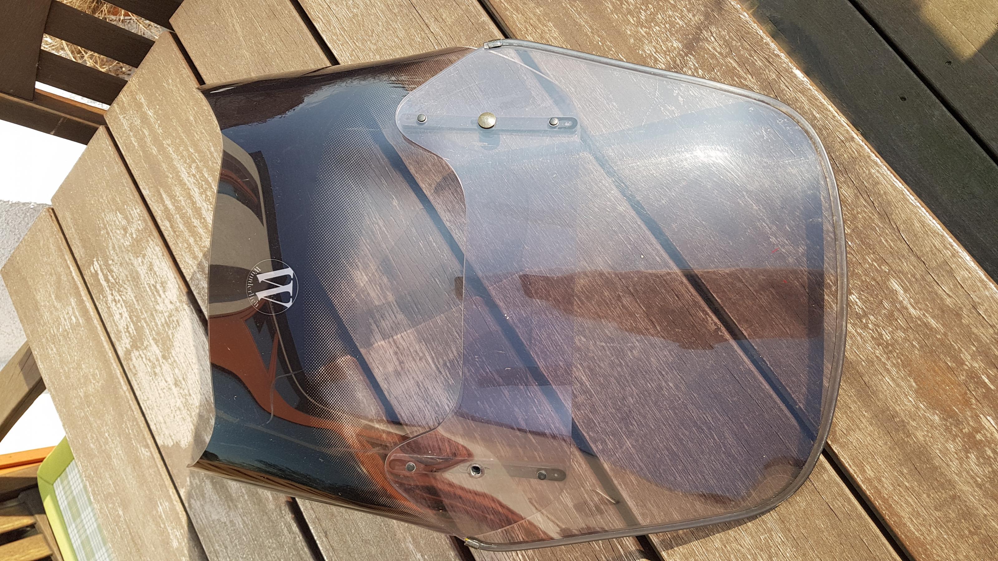 Das Windschild ist in gepflegtem, gebrauchtem Zustand. Farbe Rauch-Grau getönt.