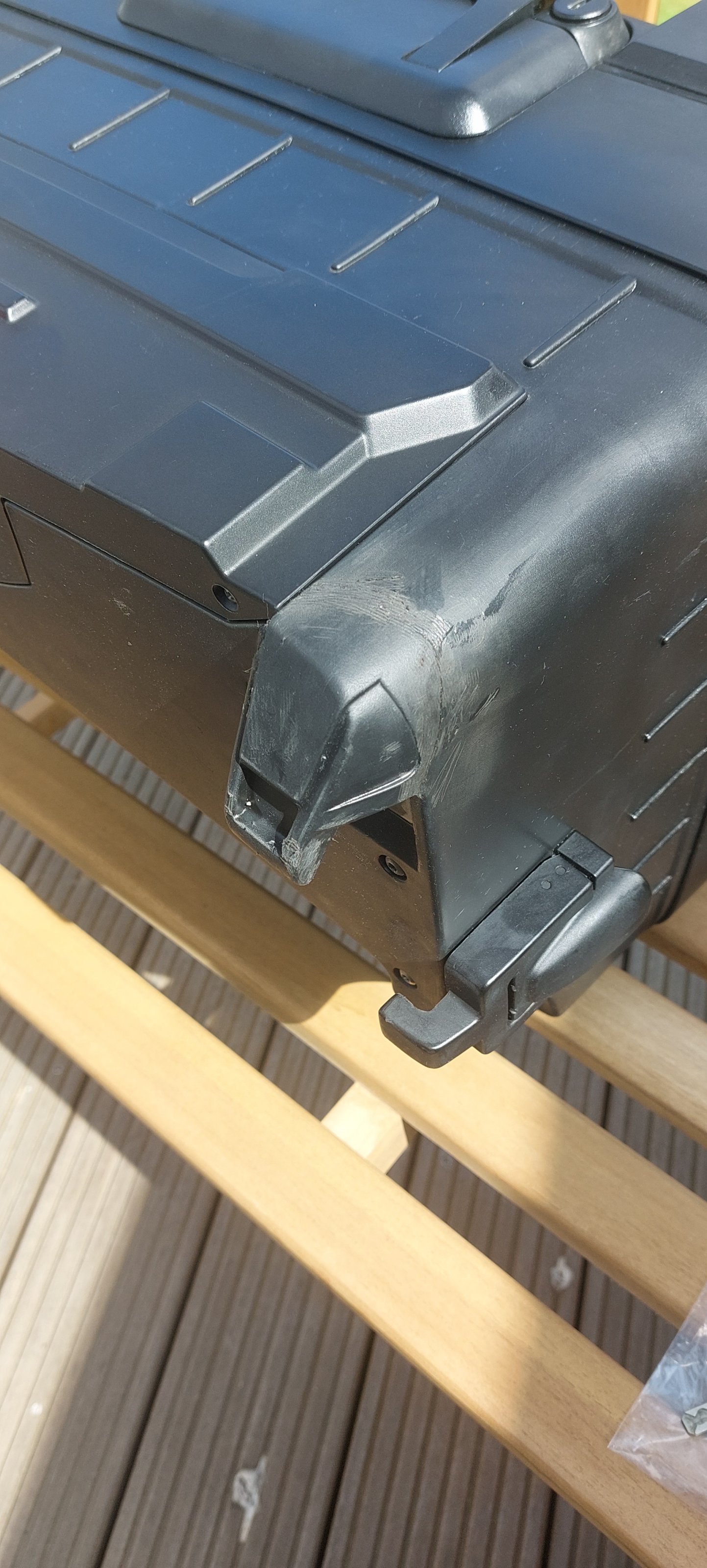 Beim linken Koffer gab eine Beschädigung durch einen Umfaller. Die Rastnase war abgebrochen. Das habe ich aber üppig verstärkt und geklebt. Das hält.