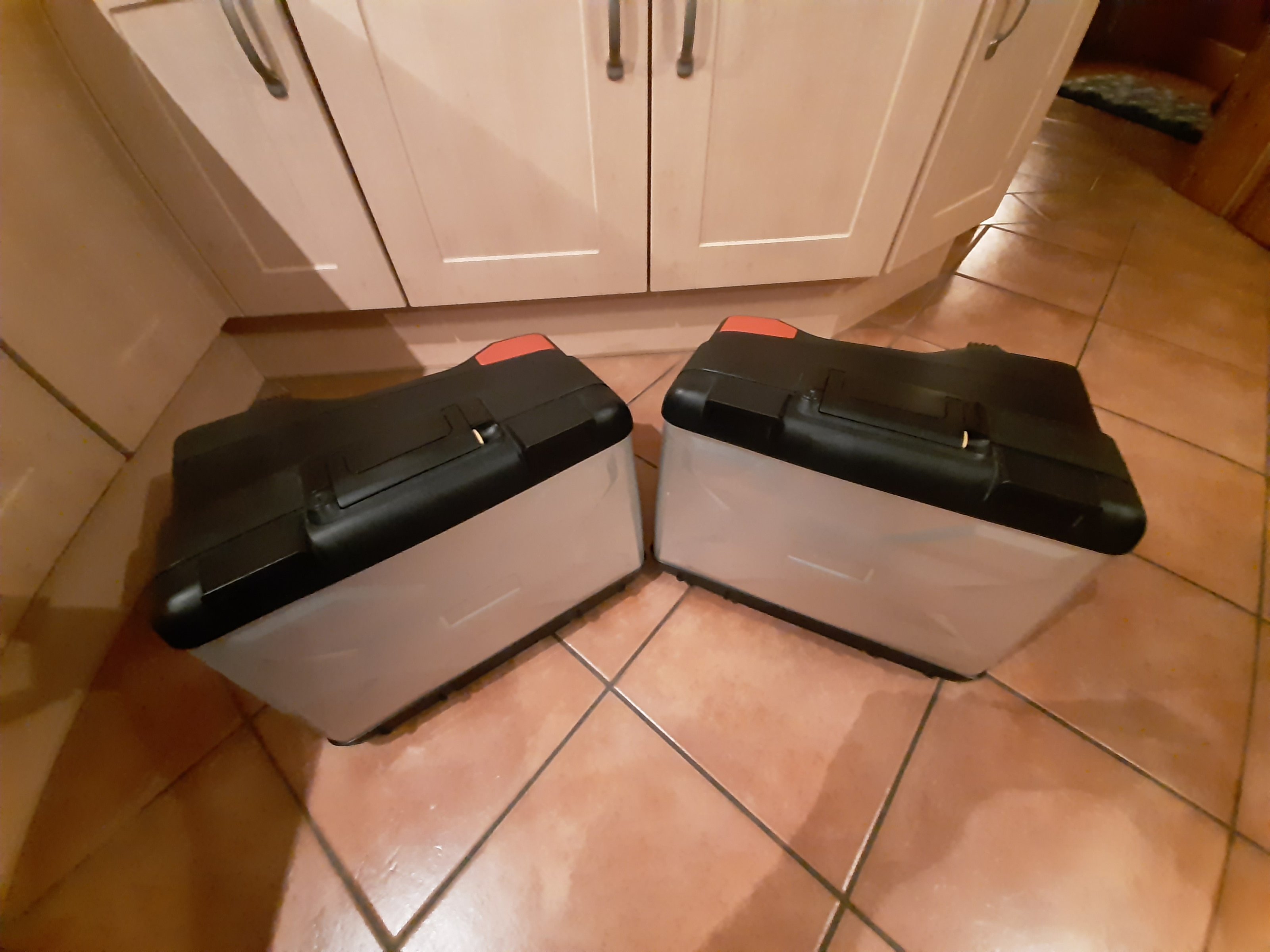 habe meine 2013er LC auf Alukoffer umgerüstet und biete jetzt meine Varios hier an. Sie sind sehr gut in Schuss. Schlösser sind dabei, jedoch "decodiert". Codiermatarial (Plättchen und Federn) habe ich Tütchen in die Koffer geklebt.
