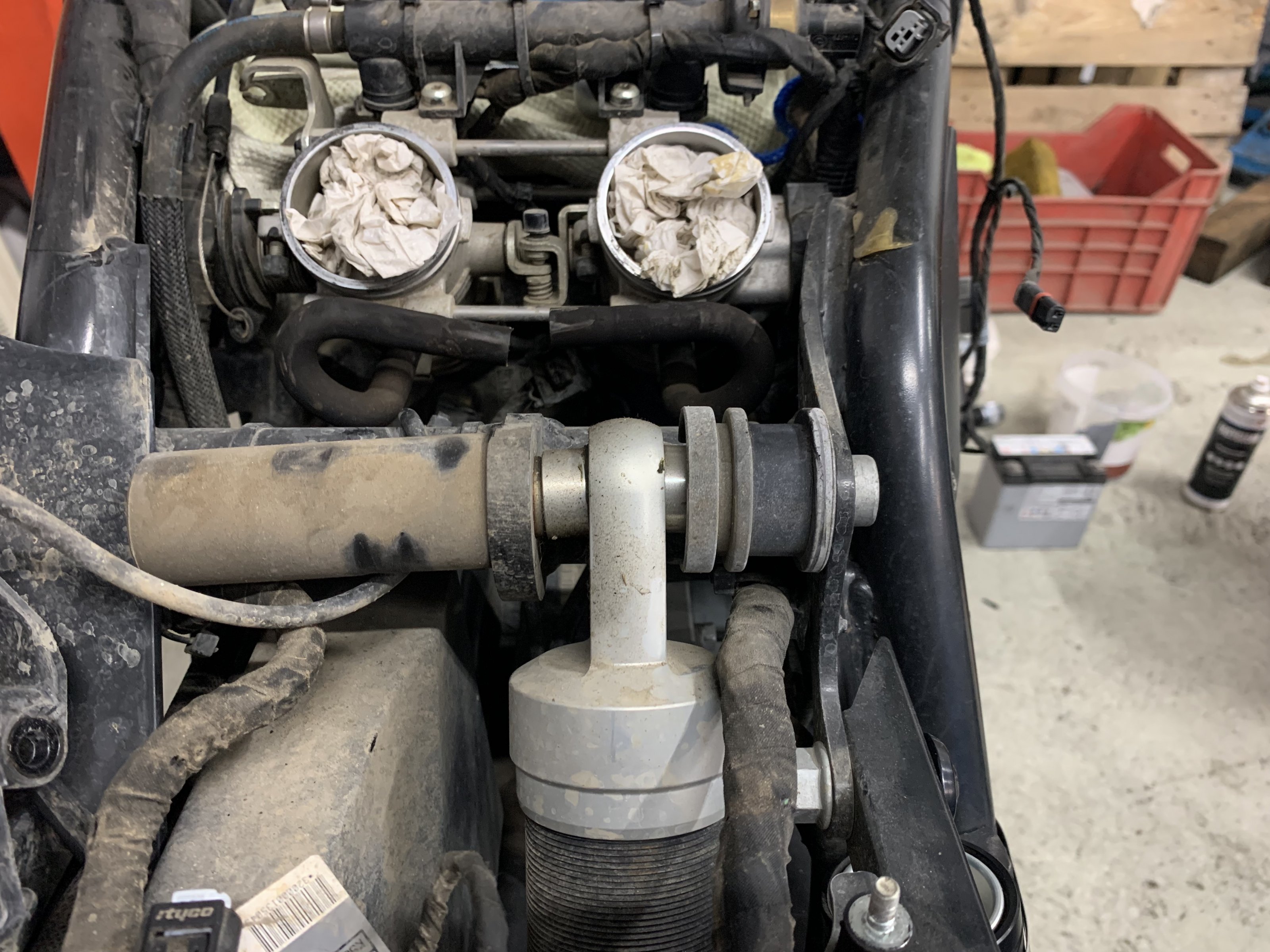 nachdem ich durch Zufall auf einen Thread im Advrider Forum gestoßen bin (Hier), wobei es um mehrere Vorfälle von verbogenen Federbeinschrauben ging, habe ich bei mir die Abdeckung auch mal abgemacht da aktuell eh alles zerlegt ist und geschaut wie es bei mir aussieht.
