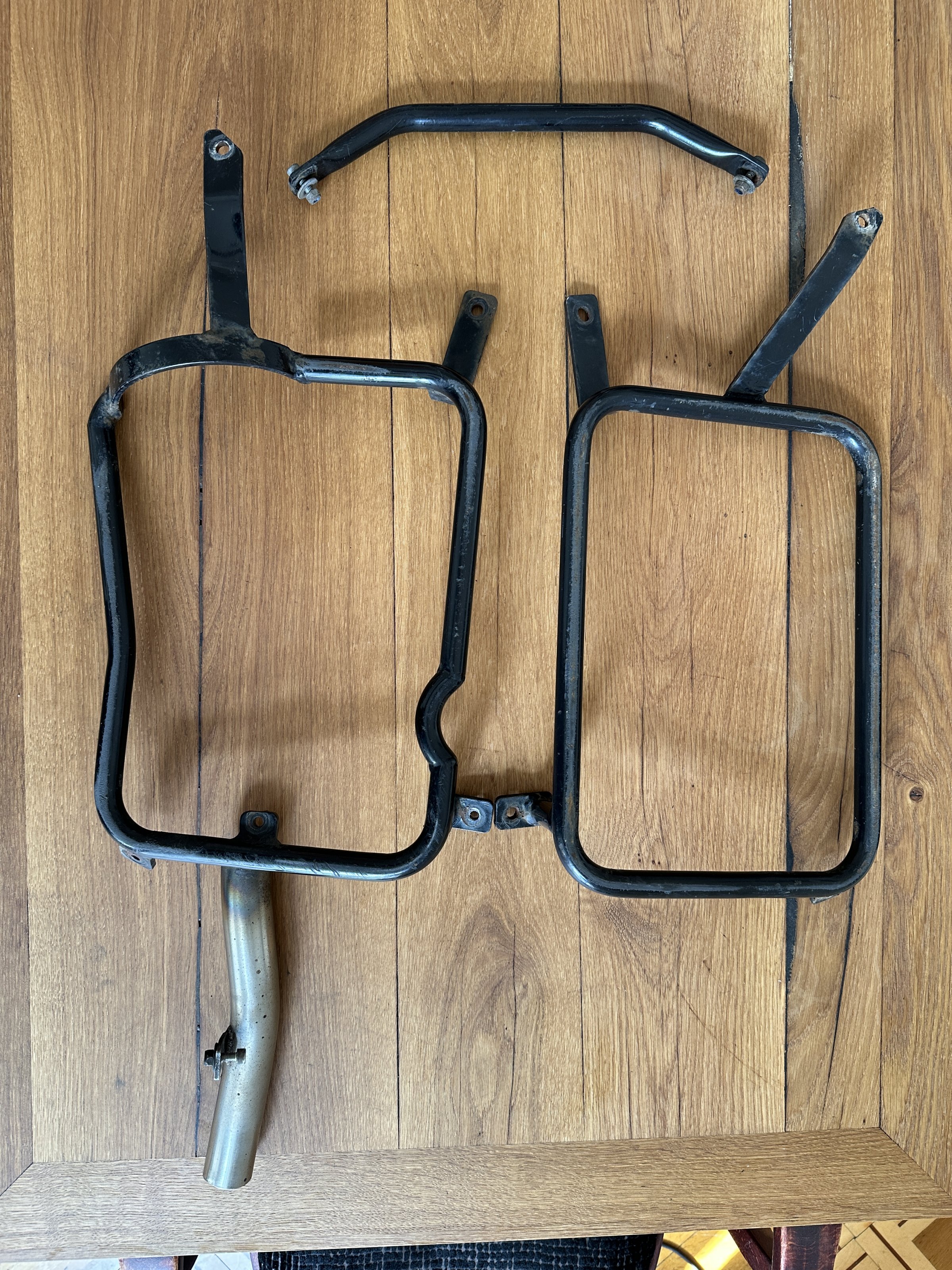 Wegen Fahrzeugwechsel steht dieses legendäre Trägersystem mit 2 Koffern, 4 gleichschließenden Schlössern und einem Originalschlüssel zum Verkauf. Aufgrund der speziellen Ausformung des linken Trägers und Koffers passt das System meines Wissens nur in Verbindung mit dem Originalauspuff.