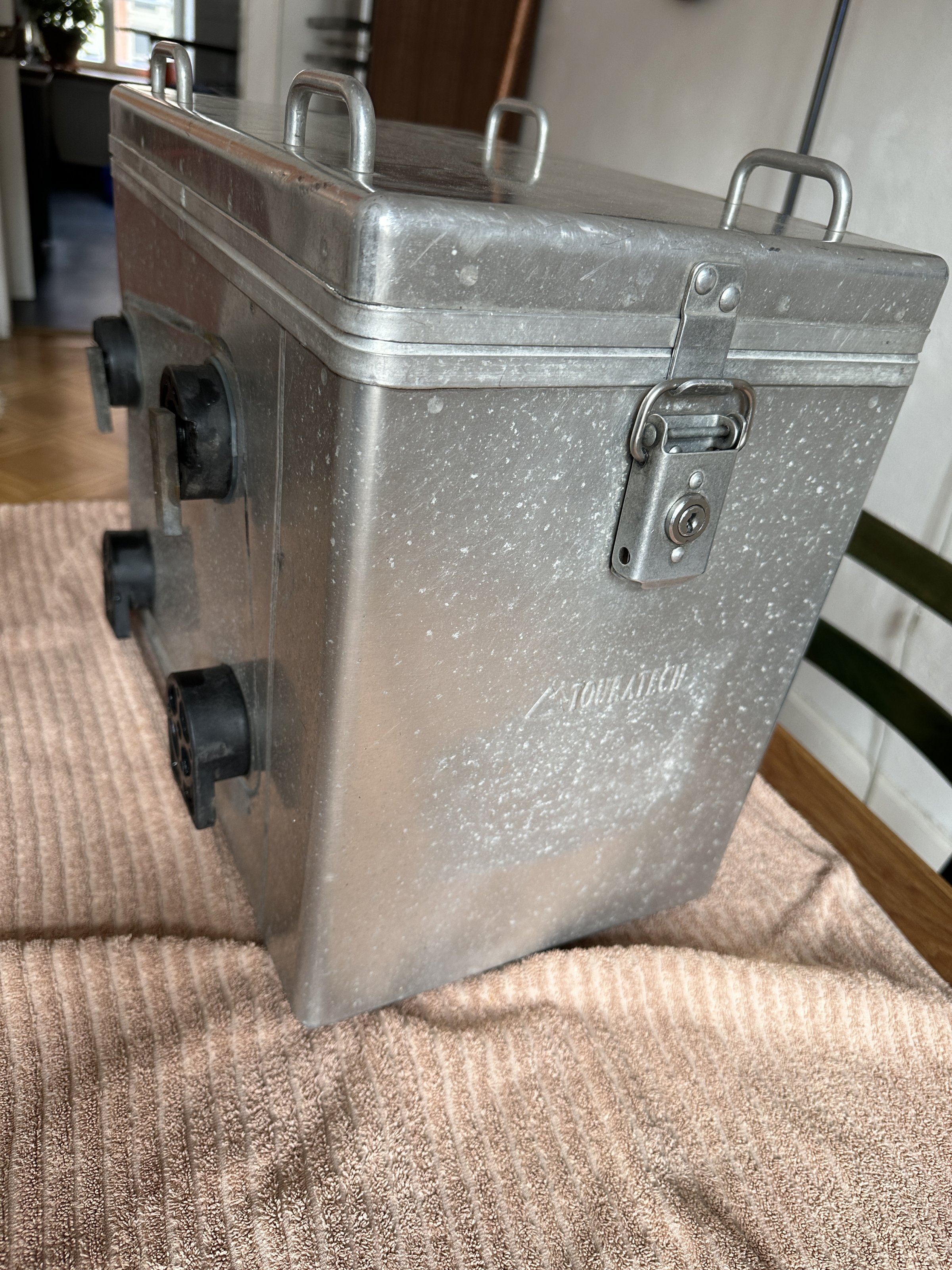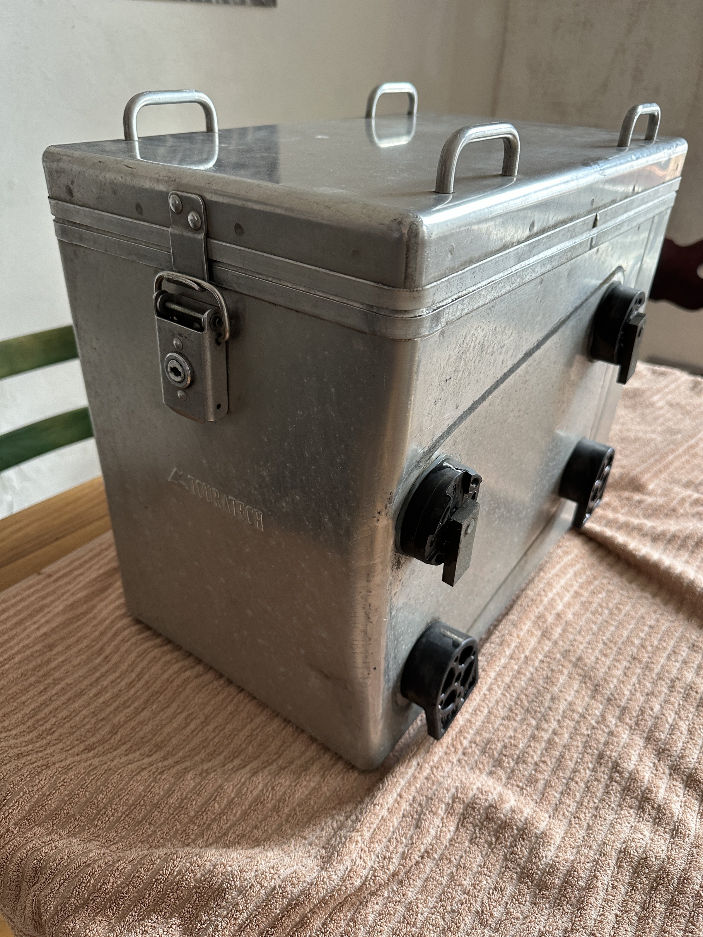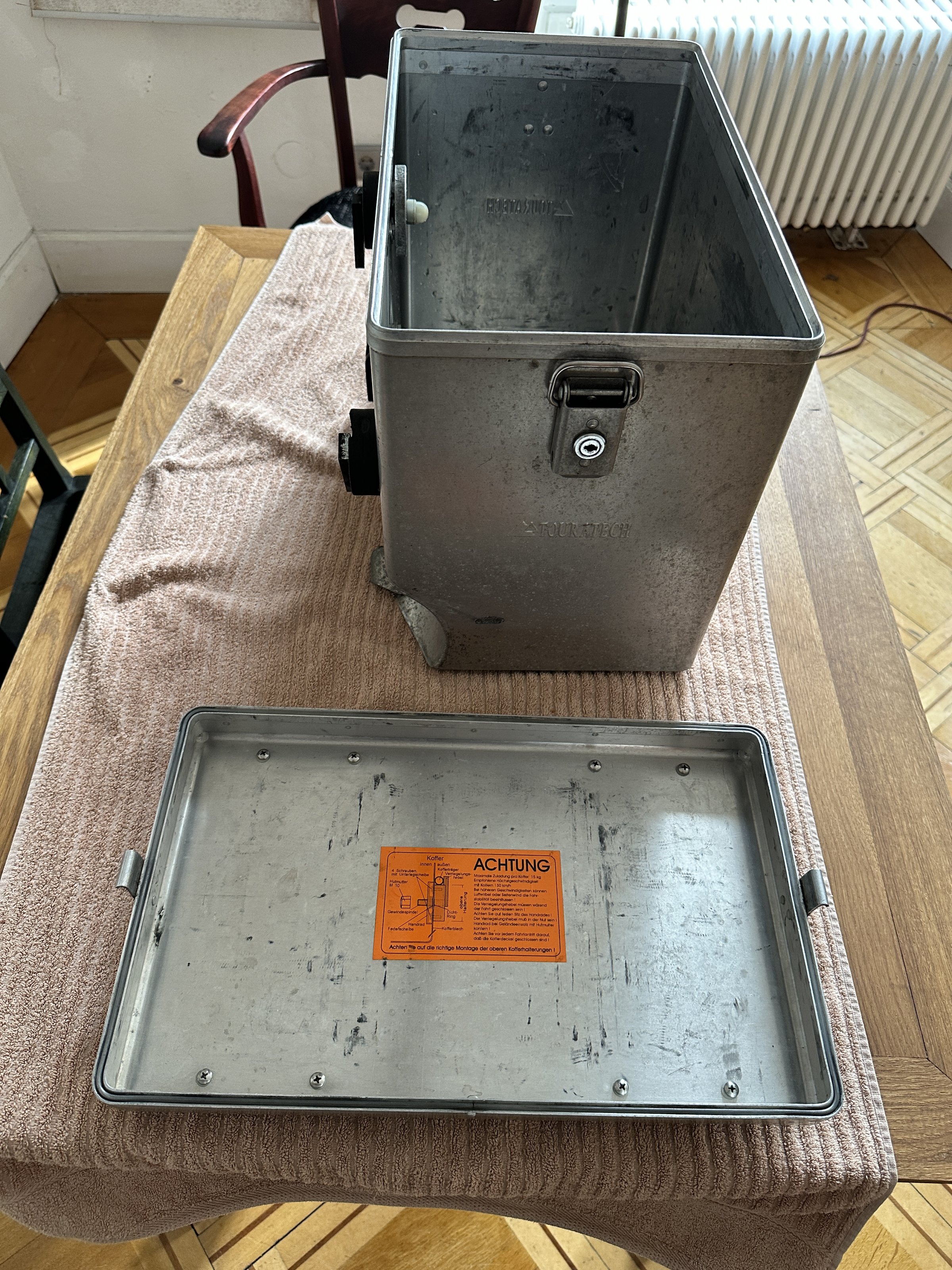 Weil es sich hier um nicht-eloxiertes Alublech handelt, ist es ratsam, immer mit schmutzresistenten Gepäckstücken zu reisen, sonst gibt es hässliche schwarze Alu-Abriebspuren. Die Original TT-Packtaschen sind leider nicht mehr vorhanden.