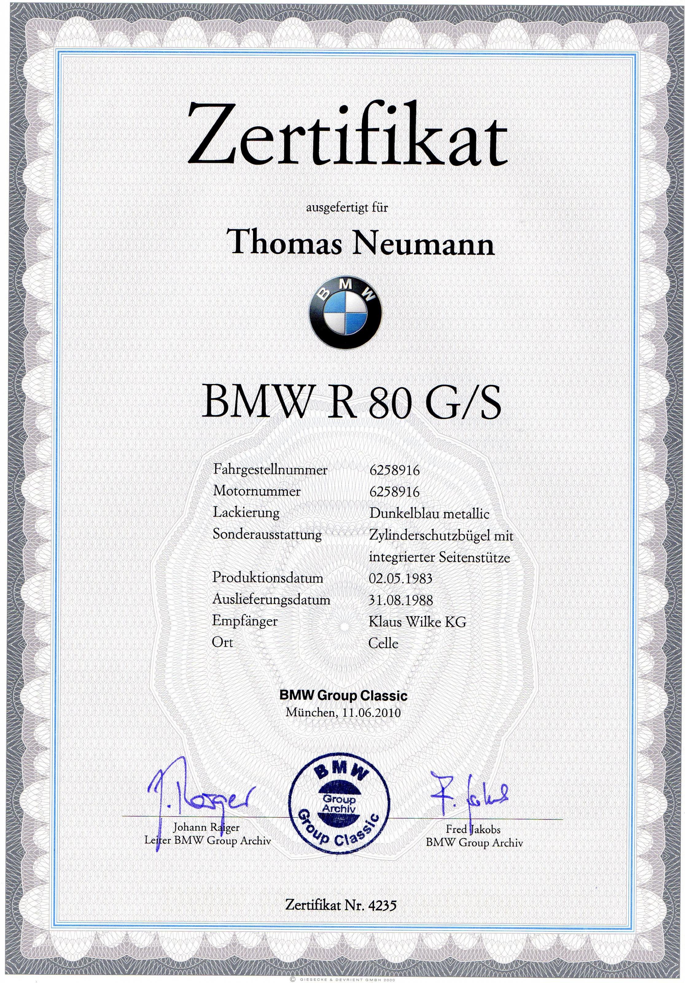 Zum Verkauf steht meine R 80 G/S im Farbton blau. Die BMW ist im fast Originalzustand. Es sind breitere Fussrasten von der ST 80 und ein anderer Tacho von der 100 GS verbaut. Der Tacho hat die gleiche Wegstreckenzahl, das Tachoblatt geht aber bis 200 km/h statt 180 km/h.Kilometerstand 23000 km. Das Fahrzeug hat eine gesamtlaufleistung von 32000 km. Der Rahmen wurde 2013 schwarz Kunststoffbeschichtet. Neuteile - Anlasser - Zündspule - Bremsscheibe - Kreuzgelenk - Hauptbremszylinder usw. Die Zulassunghistorie ist auch für mich nicht ganz einfach nachzuverfolgen. Laut BMW - Zertifikat ist das Bj. 2.5.1983 -Auslieferungsdatum 31.8.1988. Im alten Fahrzeugbief ist als Tag der ersten Zulassung der 6.4.1994 eingetragen.( Verkauft durch Fa. Zitsewitz - Karlhof - hier im hohen Norden.