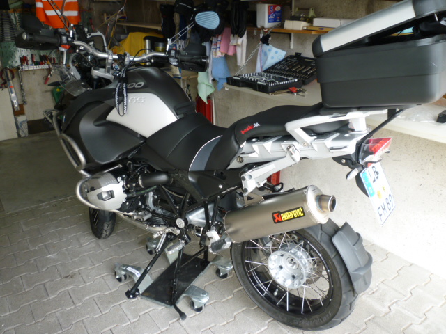 Die R 1200 GS Adventure wurde mittels WESA Fahrwerk 5 cm tiefergelegt. Fussrastentiefergelegt und gegen die der GS ausgetauscht. Umbau auf Variokoffer und TC. Verstellbare Zubehörschalt- und Kupplungshebel. MFW Totwinkelspiegel. Handschützererhöhung. Schutzblechverlängerung vorne. Hinterradabdeckung von PUIG. Halter für Zumo 550 mit abschließbarer TT Halterung. Seitliche Kunstoffabdeckungen schwarz. Baehr Sitzbank mit Heizung.Griffheizung. Gegensprechanlage mit Kabel und Stecker für Fahrer und Sozia. Scheibenaufsatz von TT abschließbar. Wunderlich Ölkühlerschutz. Seitlich sind Kunstoffabdeckungen von Wunderlich schwarz. Bremspedalverlängerung klappbar. Schalthebel Längenverstell- und klappbar. Originalauspuff gegen Akrapovic getauscht. Reifen noch i. O. Speichen noch alle i.O. da kein Geländeeinsatz. Zur Original Steckdose noch zusätzlich eine Zubehörsteckdose montiert - Batterieerhaltung. Ebenfalls noch zu haben eine Hohlnabenabdeckung am Hinterrad von Wunderlich.