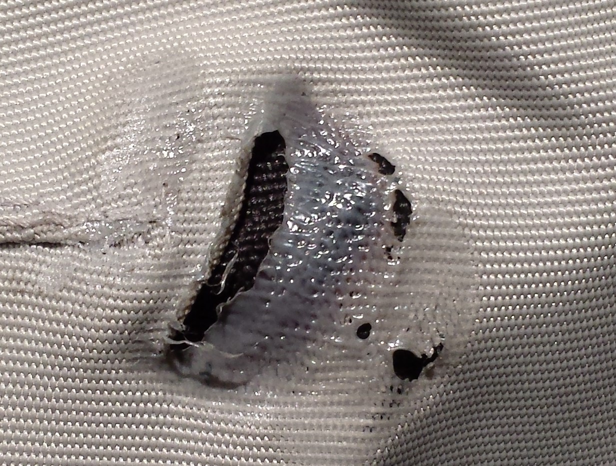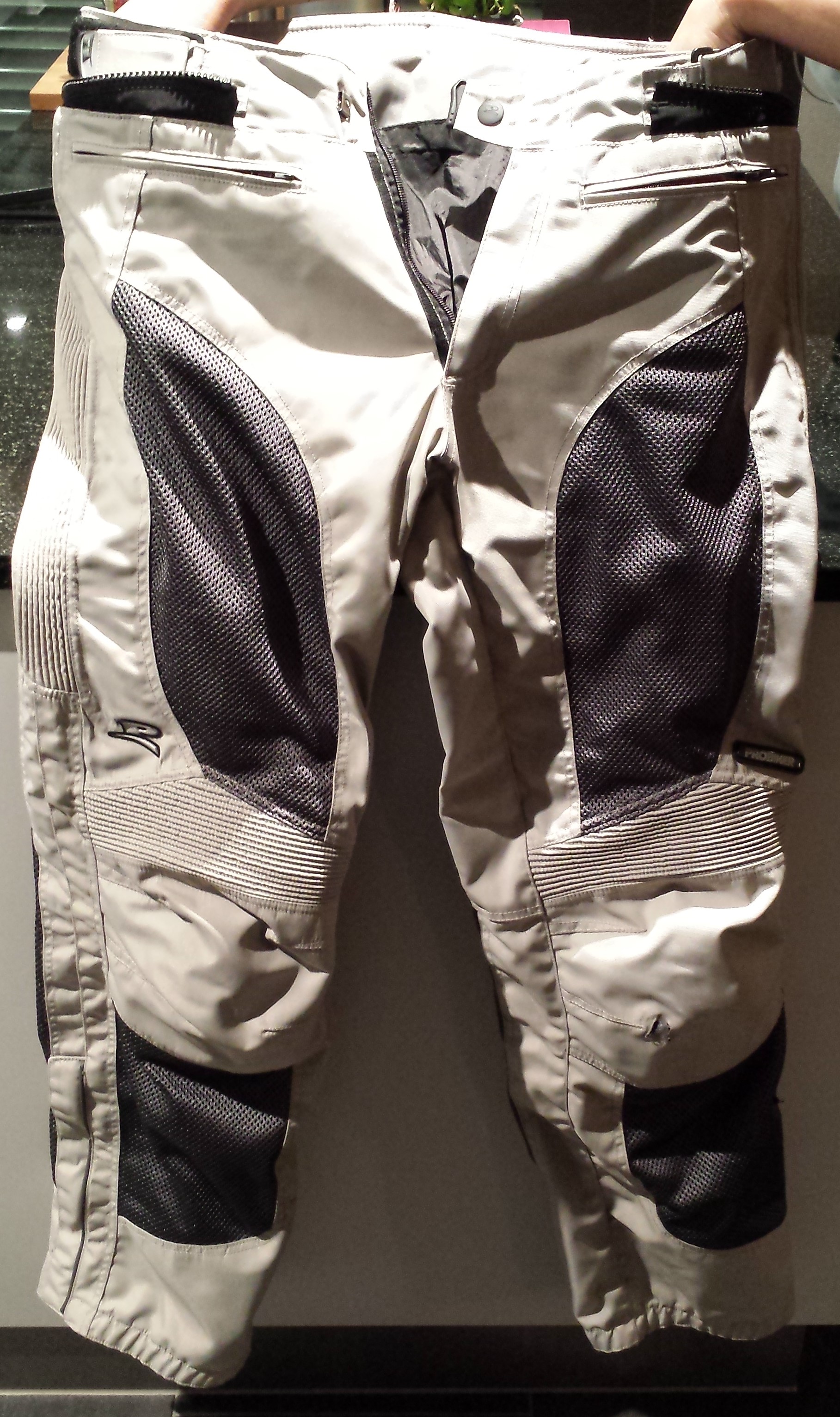 Zusätzlich habe ich noch Hüftprotektoren und einen Rückenprotektor dazugekauft. Das linke Knie habe ich am Auspuff etwas angesengt (siehe Bild).