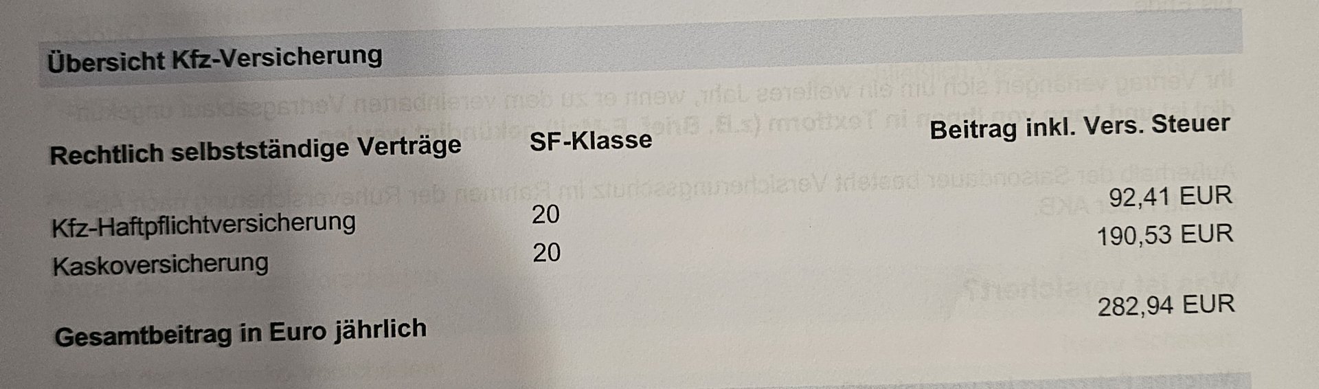 Teilkasko ohne SB , Vollkasko mit 500,-€ SB ..... 282,-€ .... !!! 9000 km im Jahr .... !!!
