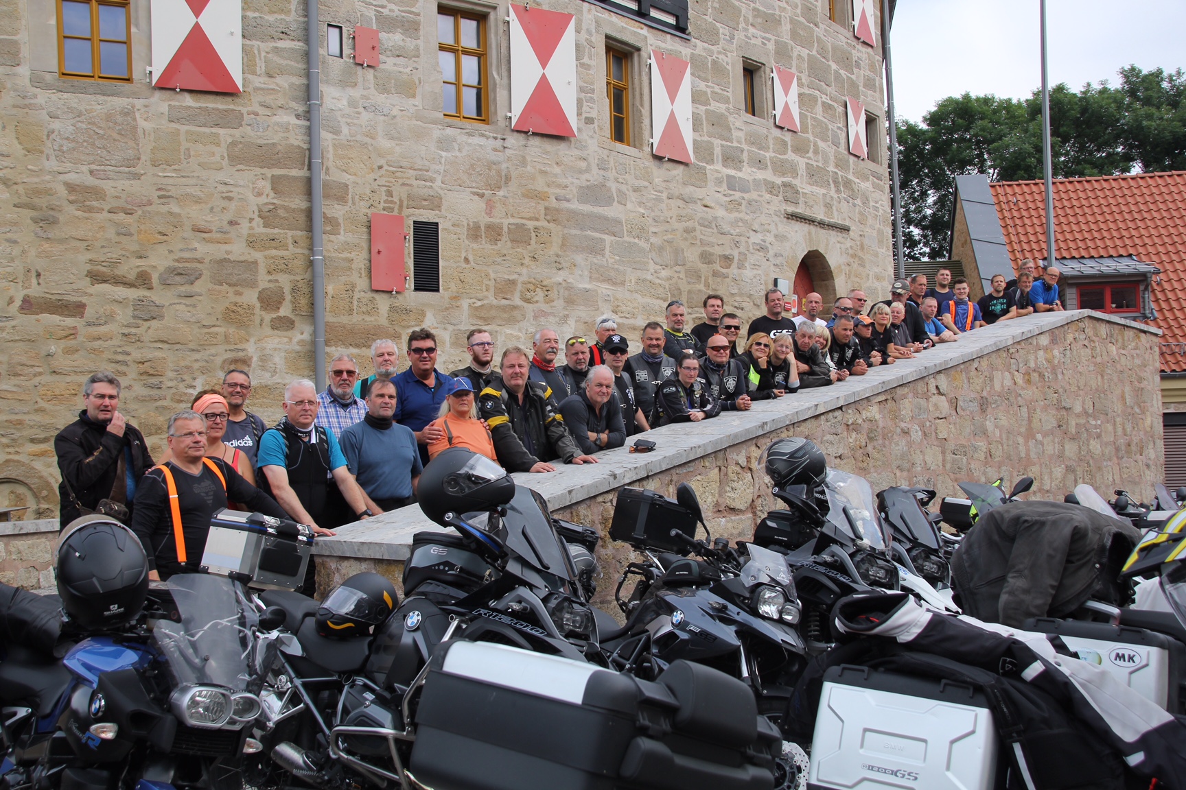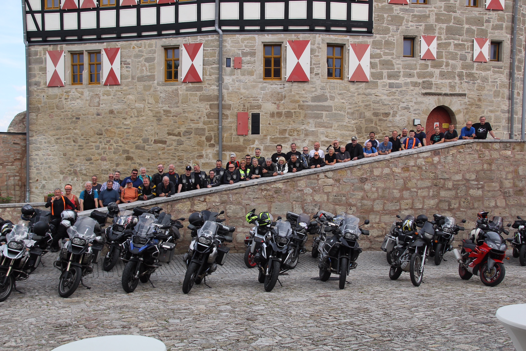 - Nach dem Mittagessen geht es dann auf den zweiten Teil der Ausfahrt mit dem Ziel „Burg Scharfenstein“ ... wenn das obligatorische Gruppenfoto im Kasten ist, geht es geschlossen mit allen Bikes im Konvoi zum Hotel zurück