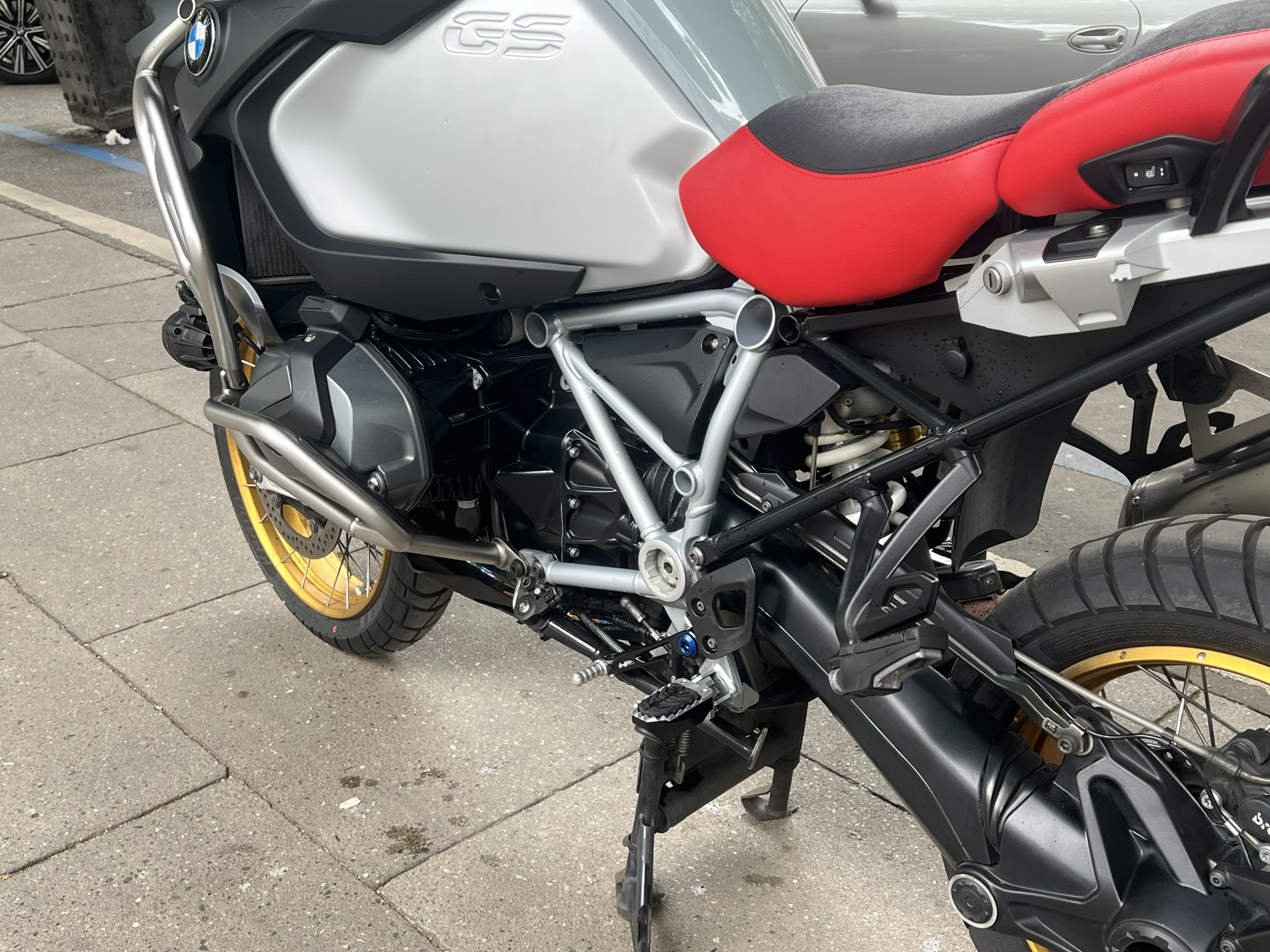 Fahrer- und Beifahrer- Sitze beheizbar, Neubezug, zweifarbig, Rot/ Schwarz analog der Originalfarbgebung mit höherwertigem/ Material stärkerem Bezugsstoff in Automobilqualität mit Ton-in-Ton- Sattlernaht und GS- Schriftzug mit dem Ziel: Aufpolstern mit härterem Schaumstoff um weniger einzusinken/ höheren Stützeffekt vorn zu erzielen, um dem Eindrehen der Hüfte entgegenzuwirken, sehr aufwändig durchgeführt von Sattlerei Kinzlin, HH.