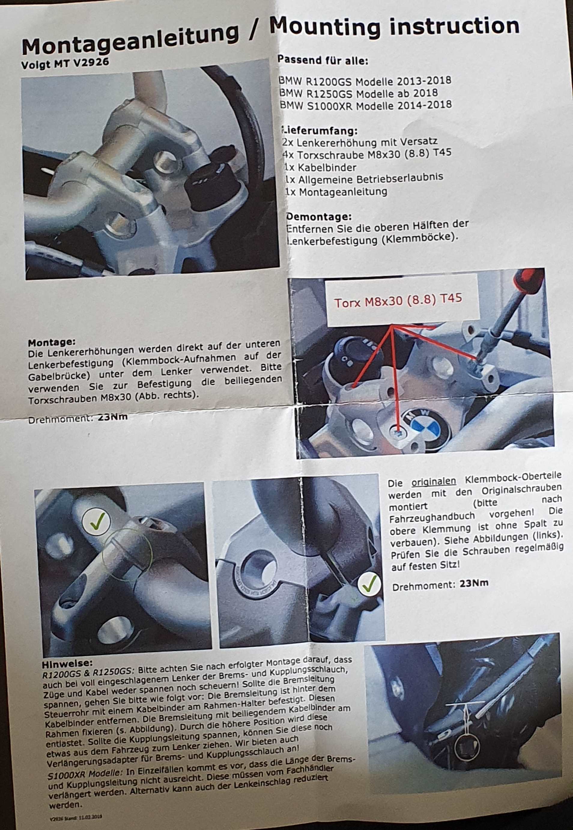 würde gerne Lenkererhöhung mit Versatz für BMW R1250GS & Adv. 18-, 78,95 € kaufen und montieren. Habe dazu eine Frage.