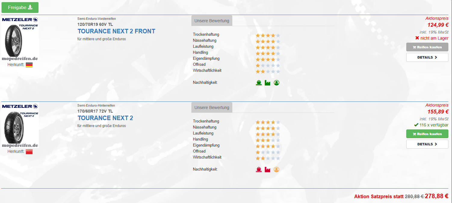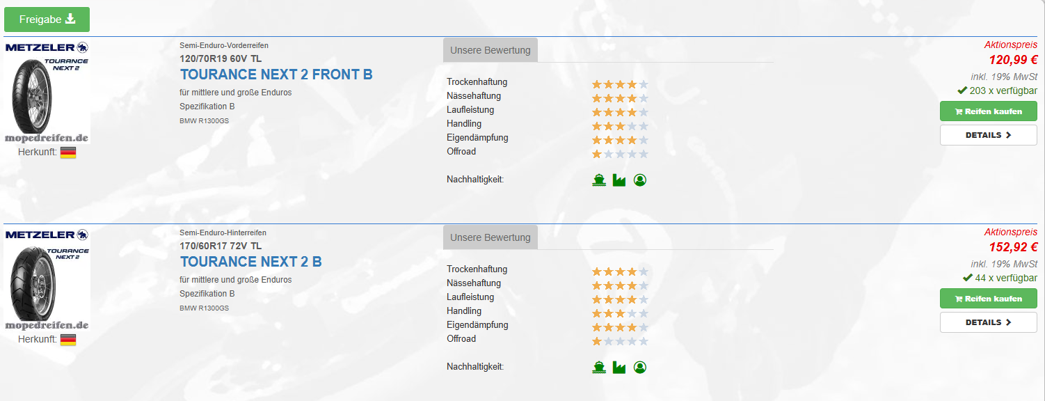 Diskutiere Vorstellung - Metzeler Tourance Next 2 im Reifen Forum im Bereich Modellunabhängige Foren; @FinallyGS lt. HP hat Mopedreifen aber (noch 🤷‍♂️ ) beide verfügbar.. und die "Nicht B" sind teuerer als die speziell für die R 1300 GS...