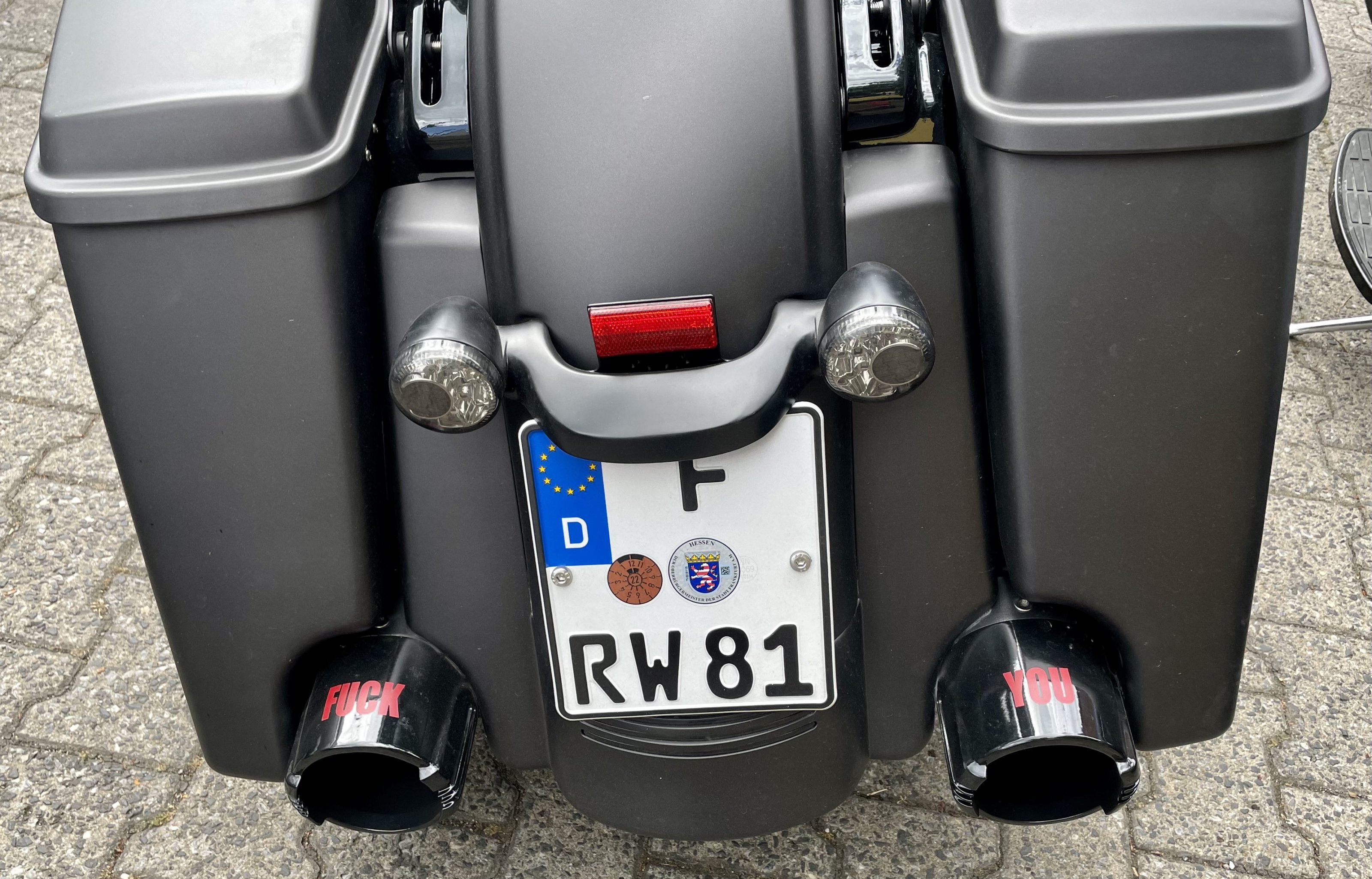 Vor der Harley-Factory? Der Besitzer dieser Maschine fährt ganz sicher nicht in Warn-, sondern (wenn er es in der Öffentlichkeit noch dürfte) in rot-weißer und geflügelter Weste. (Die warnt natürlich auch irgendwie vor was...
