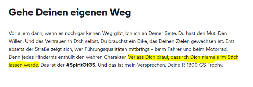 Naja, sie sagen auch auf der Homepage mit anderen Worten schon deutlich, dass sie die GS durchaus als - Premium - Bike sehen. Wenn man auf der Homepage ständig Wörter wie "Perfekt", "Offroad Champion", "Spitzenmodell", usw liest. Auch andere Hersteller haben gute Bikes, und dass sogar noch ohne ständige Probleme und notwendige Händlerbesuche.
