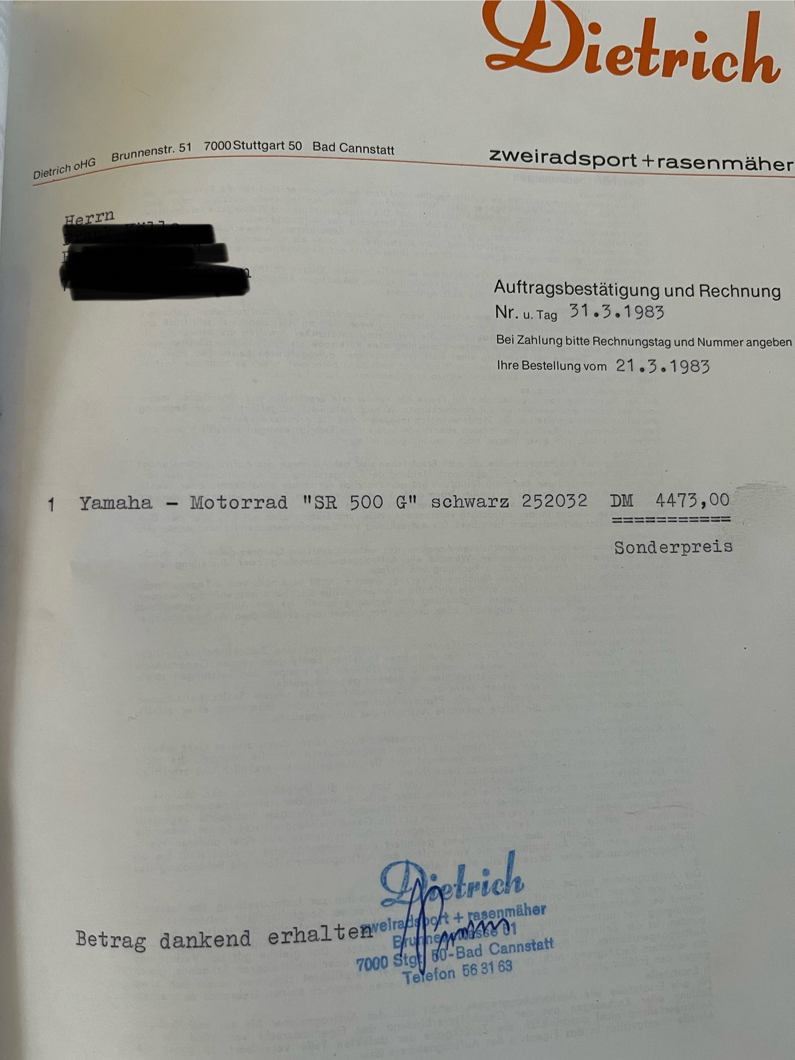War damals mit 18 Jahren mein Wunschmopped. Leider finanziell nicht machbar gewesen. Nach 38 Jahren ist jetzt doch eine in meiner Garage gelandet. Ebenfalls Baujahr 1983 und die Rechnung habe ich auch noch. Dort steht doch glatt SonderausfĂŒhrung Gussrad mit + 200 DM drauf. Wie sich die Zeiten verĂ€ndern.