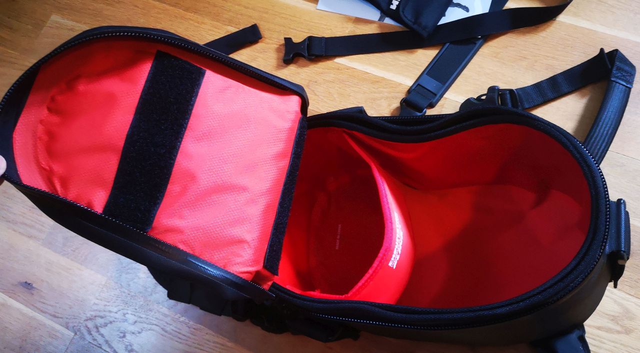 *: Wasserdicht heisst, dass das Ding auch im stärksten Dauerregen (das musste ich mehrfach ausprobieren) kein Wasser reinlässt. Zum Tauchen ist der Tankrucksack naturgemäss nicht geeignet, da hier am Reissverschluss an der Stelle, wo die beiden Zipper aneinanderstehen, Wasser eindringen könnte (DAS hab ich nie ausprobiert)