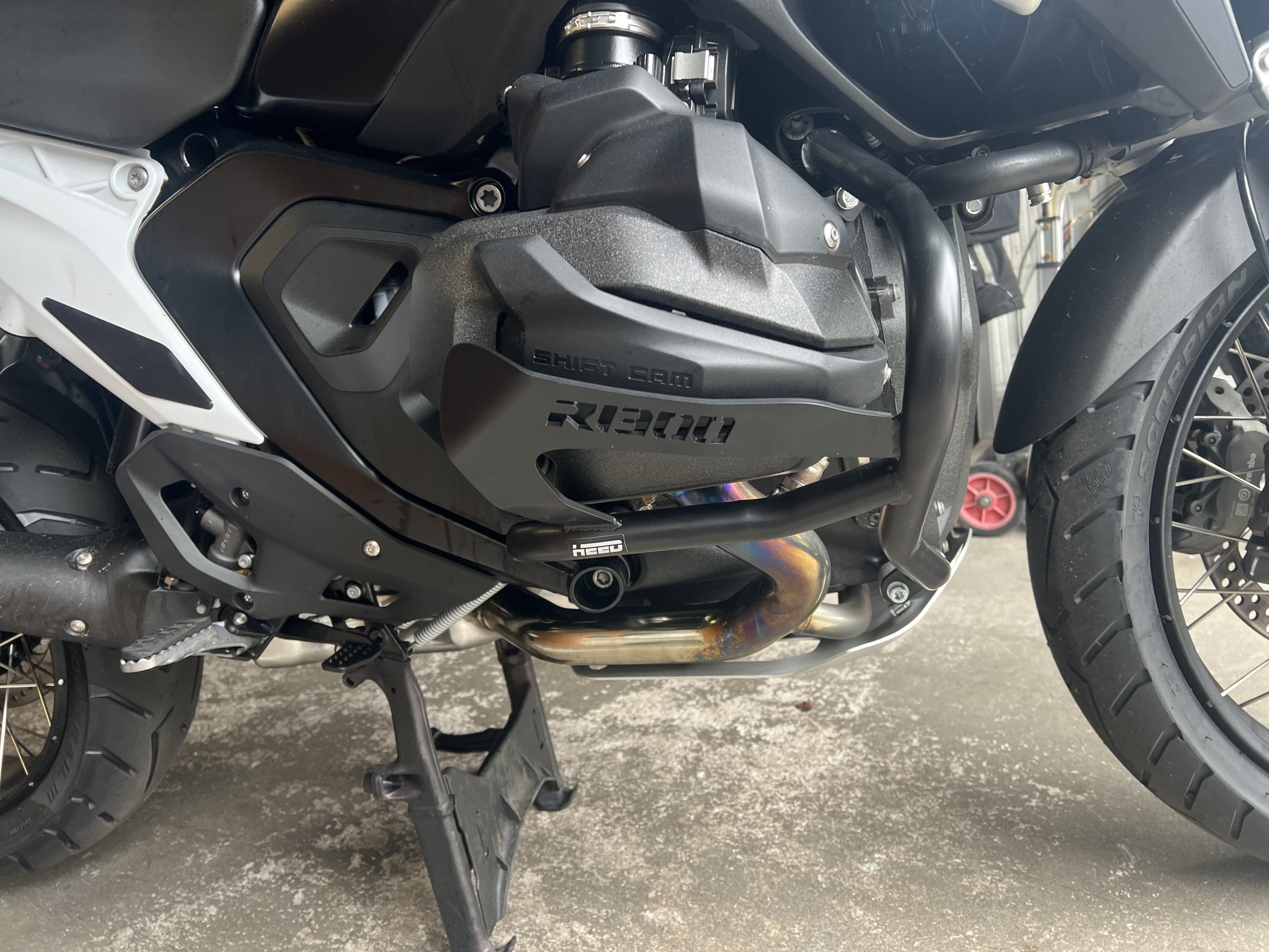 Der linke Zylinder ist etwas weiter vorne, als der rechte. :-) Kein Witz.Jo, ist Touratech. Hab die gleichen und berühre manchmal mit rechtem Schienbein die Querstrebe (178cm gross), links nie bislang. Vermutlich sitze ich nicht ganz gerade drauf..?