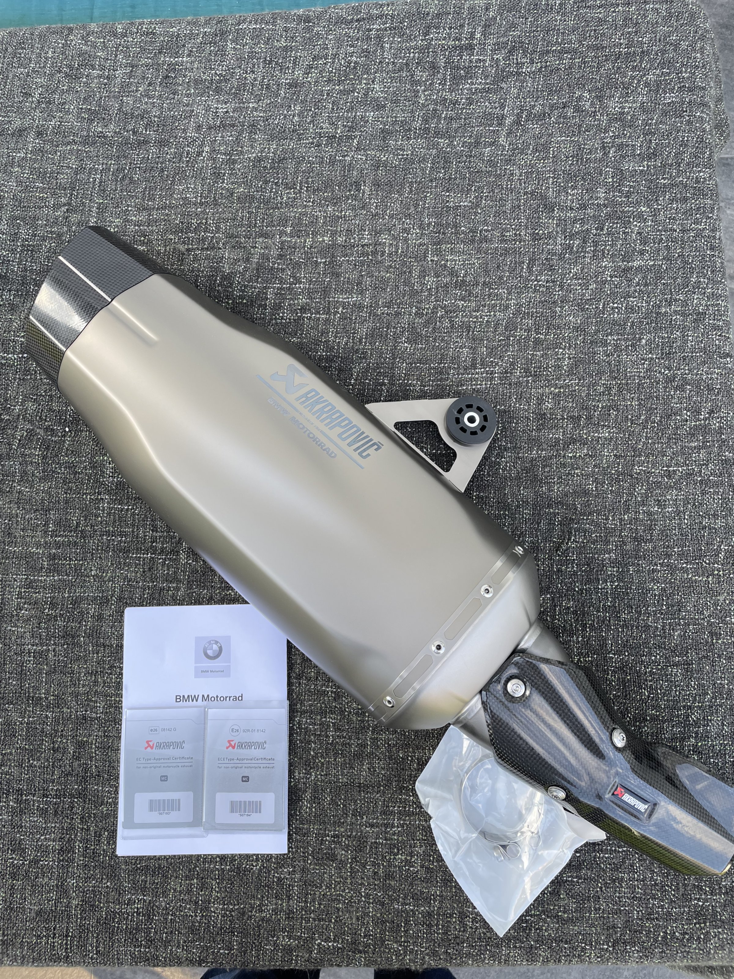 Steht bzw. stehen (also Akrapovic Nummer und BMW Nummer) ĂŒblicherweise auf der Innenseite des DĂ€mpfers , mußt ihn also wahrscheinlich (ich kenne es nur von anderen Mopeds) fĂŒrs weitere Foto nur umdrehen.