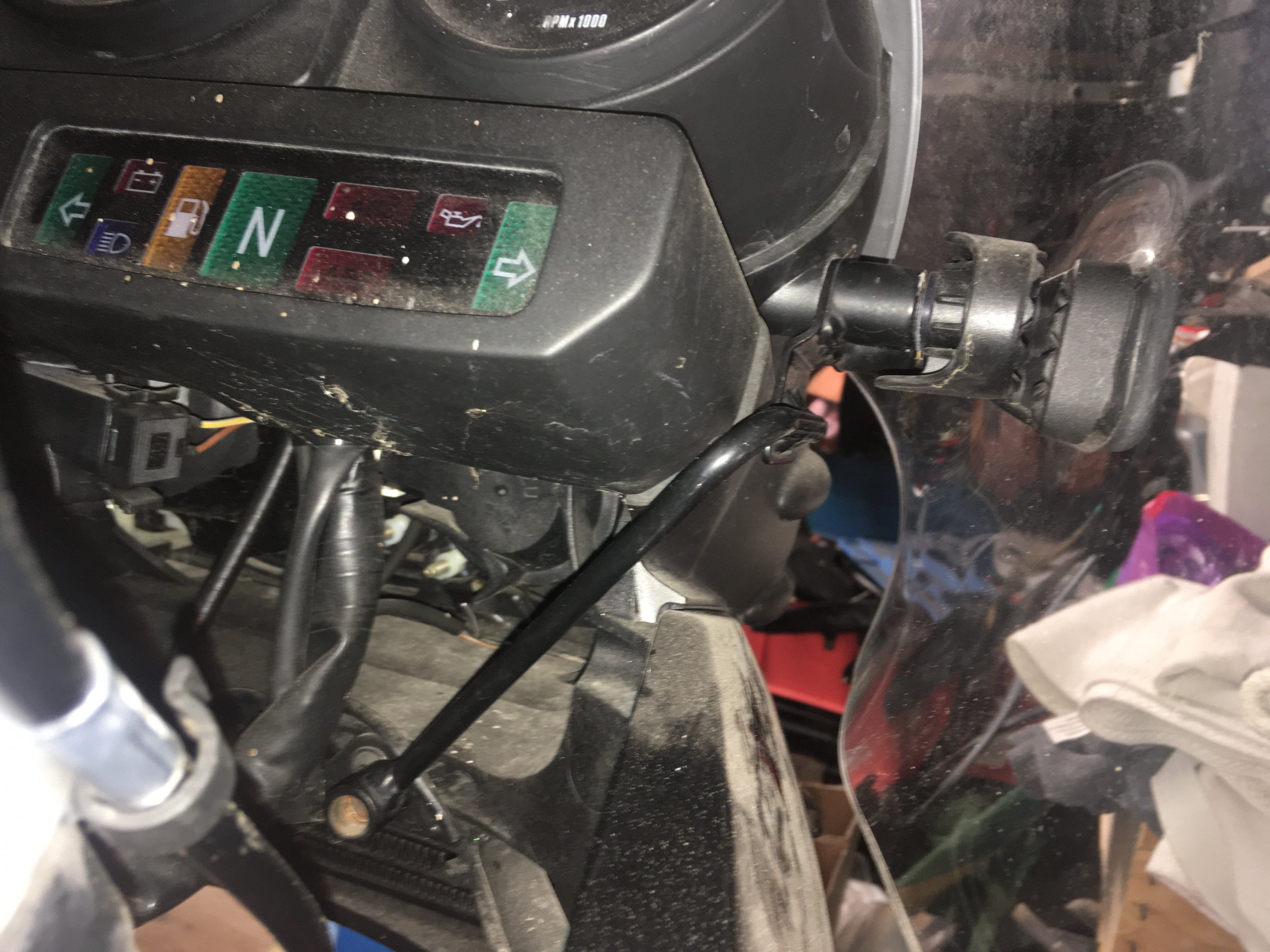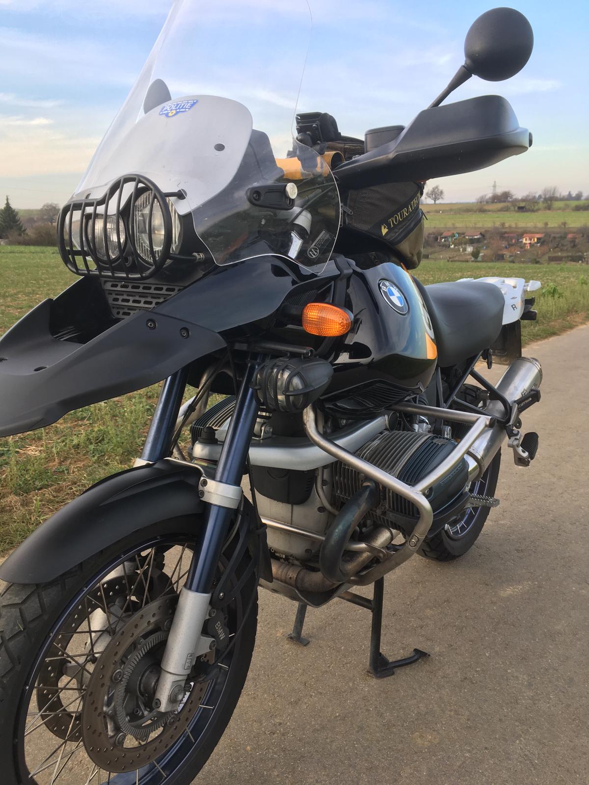 Besonderes Merkmal: Die serienmäßigen Kunststoffhalter der GS werden durch Metallarme verstärkt, die innen unter den Armaturen am Geweih verschraubt werden. Dadurch ist die Halterung der Scheibe wesentlich solider angebracht, als in Serie. Die Höhe der Scheibe entspricht etwa der von der GS-Adventure. Diese Scheibe paßt an GS und GS-Adventure, sofern die Distanzstücke der GS verwendet werden.