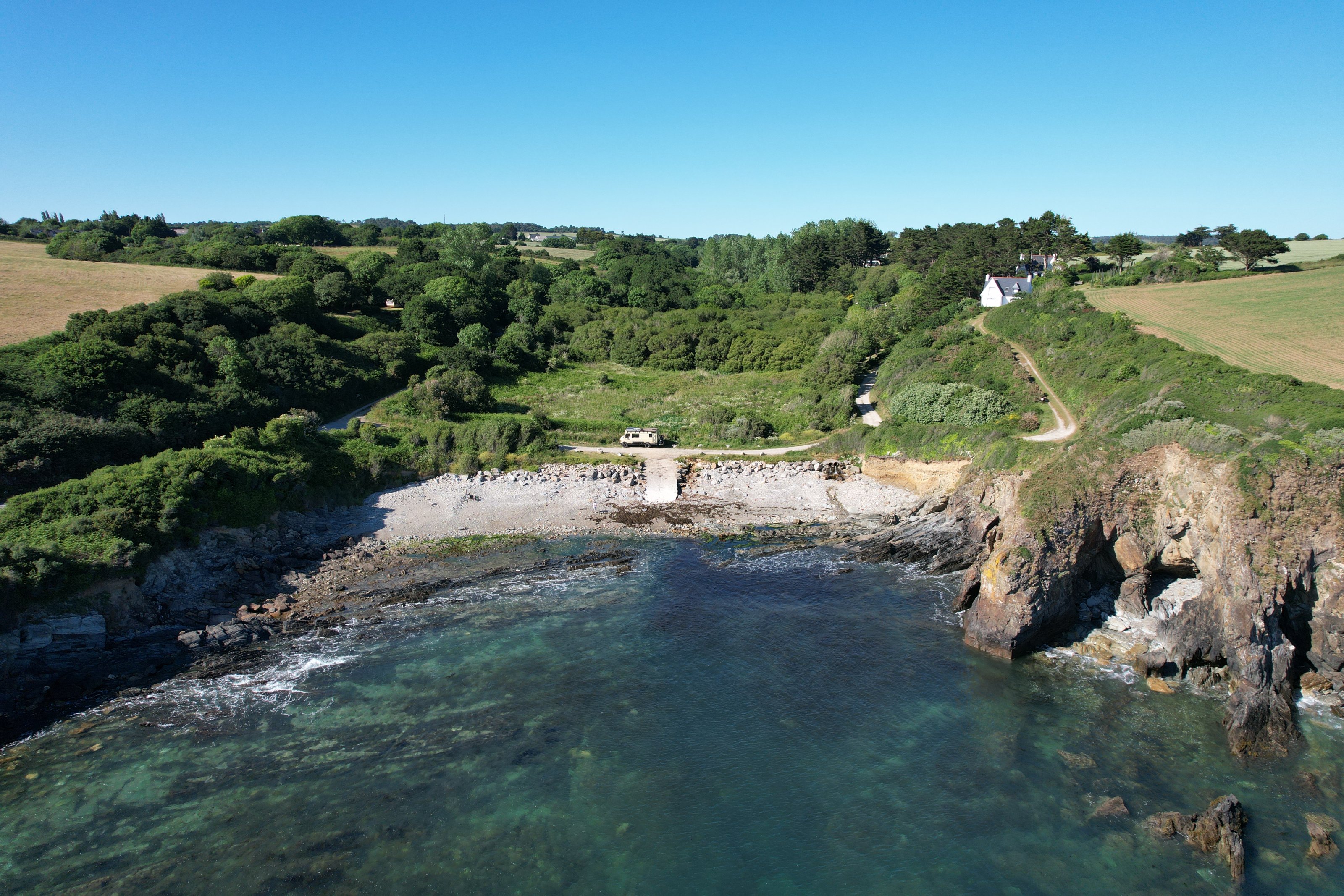 Hammer!Am nächsten Tag haben wir einen schönen Platz gesucht, sind ein paar Feldwege gefahren und dann das, bei Telgruc-sur-Mer. Kein Verbotsschild, keine Beschränkung und nur ein Platz am Rand, der groß genug ist für den Bus.