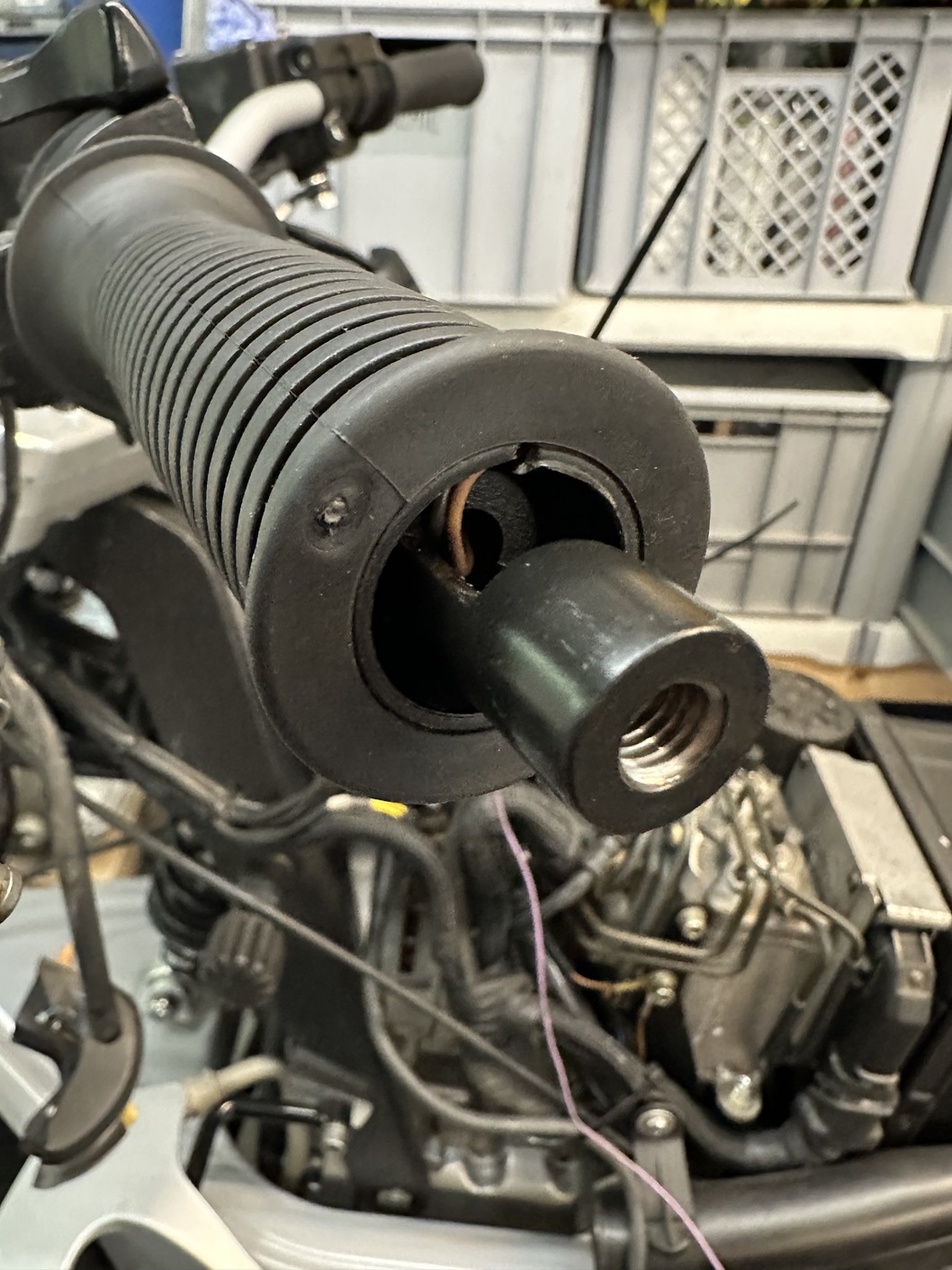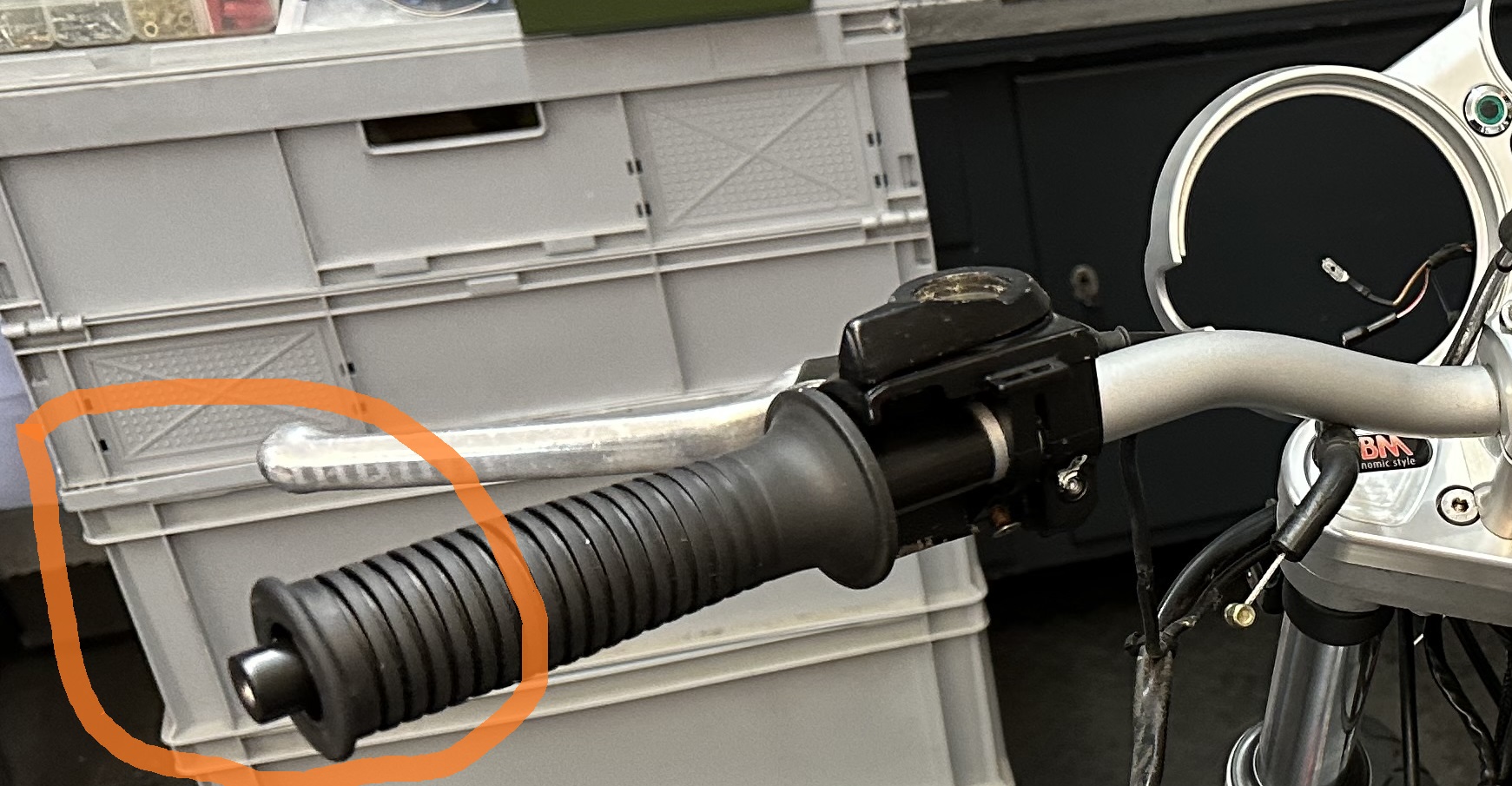 Im Lenkerbereich habe ich nochmal einen Schritt rückwärts gemacht. Die verbaute rechte Lenkerhälfte machte den Eindruck, dass sie im Übergang zwischen Aluminiumgrundteil und Stahlrohr im Griffbereich nicht mehr ganz grade ist.