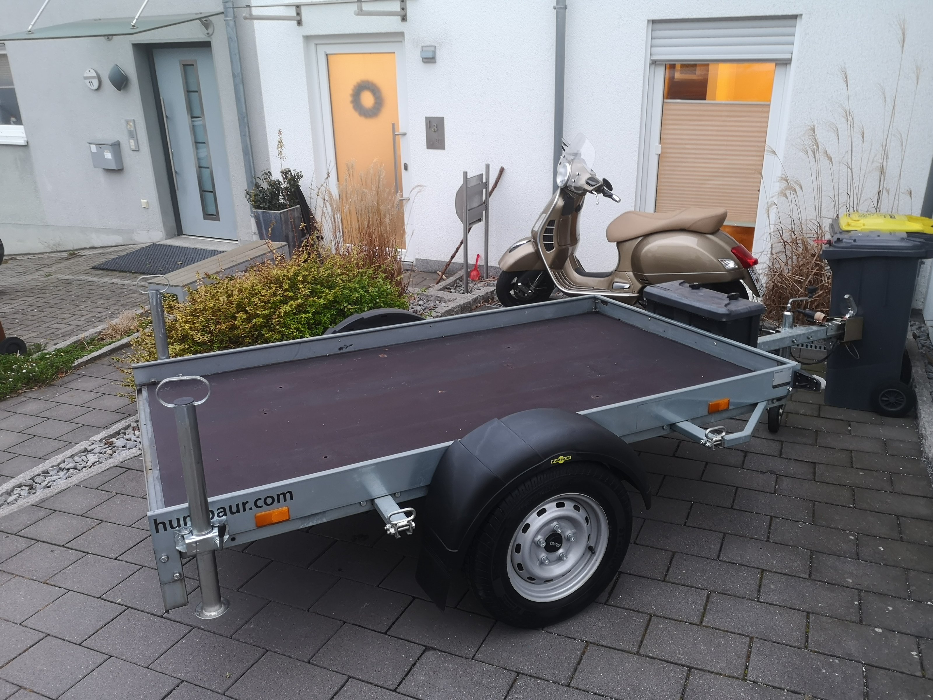 Wegen der Länge schaut die Wippe dann auf die abgeklappte vordere Ladebordwand. Ein 220 cm Hänger wäre gut gewesen, der wäre mir aber dann zu breit gewesen..