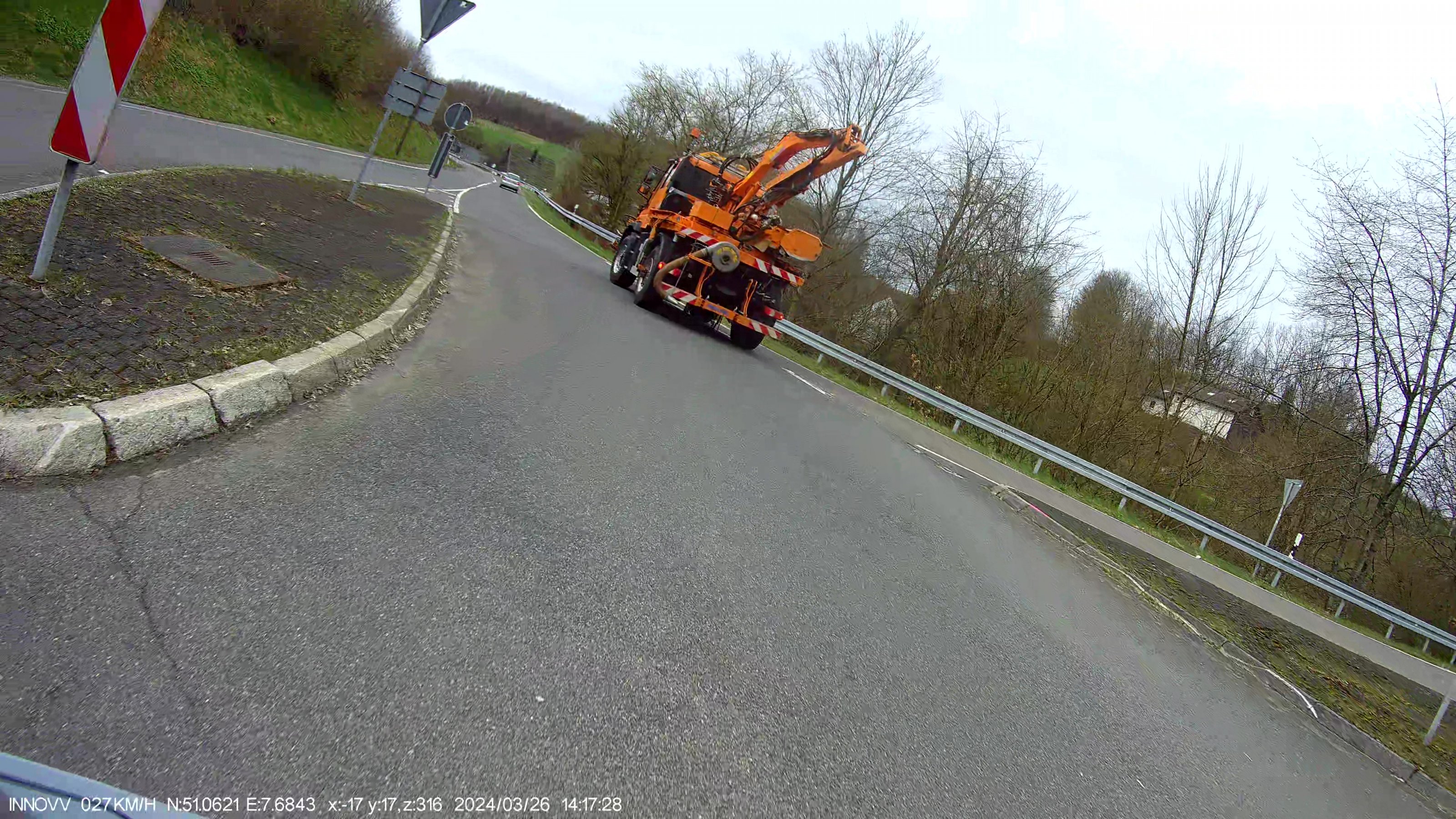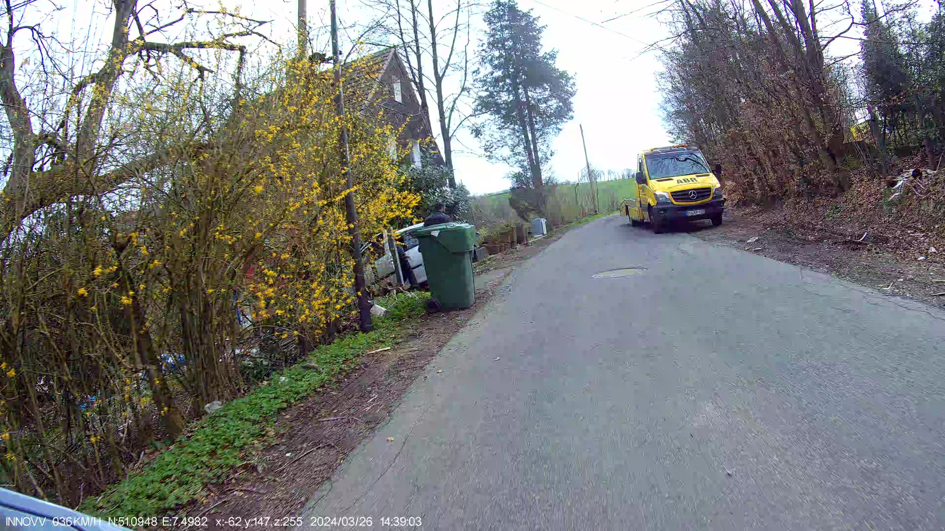Noch besser dann etliche Km weiter. Short cut, kleine K Straße durch eine Hofschaft. Ich war nicht schnell, so 30km/h. Rechts steht ein Abschleppfahrzeug. Links im Gebüsch ein Auto, das sie mit einem Seil, quer über die Straße gespannt, rausgezogen haben.