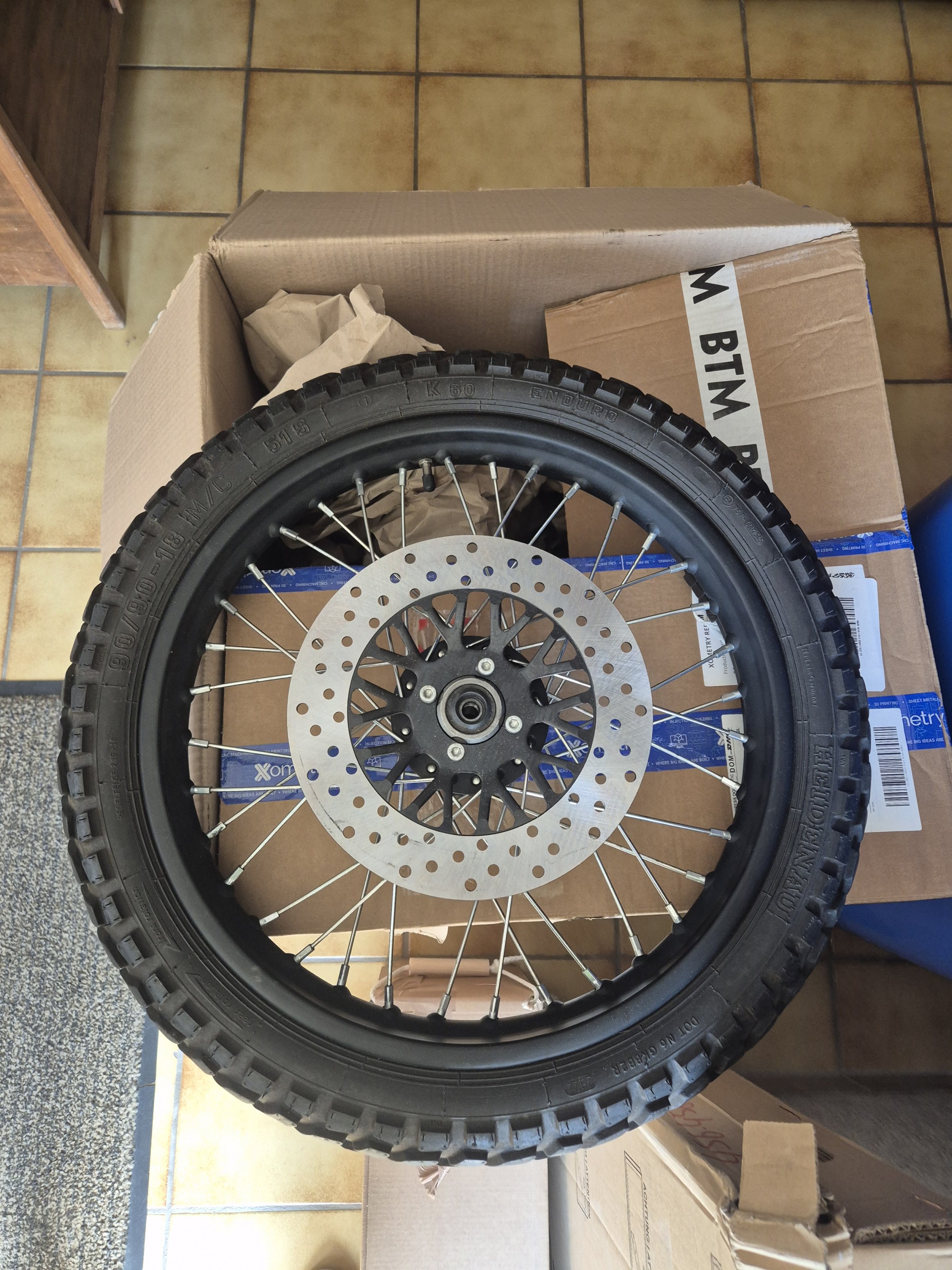 Ein Karton mit einem kompletten Vorderrad zum "einfach austauschen" incl. Retoureschein.