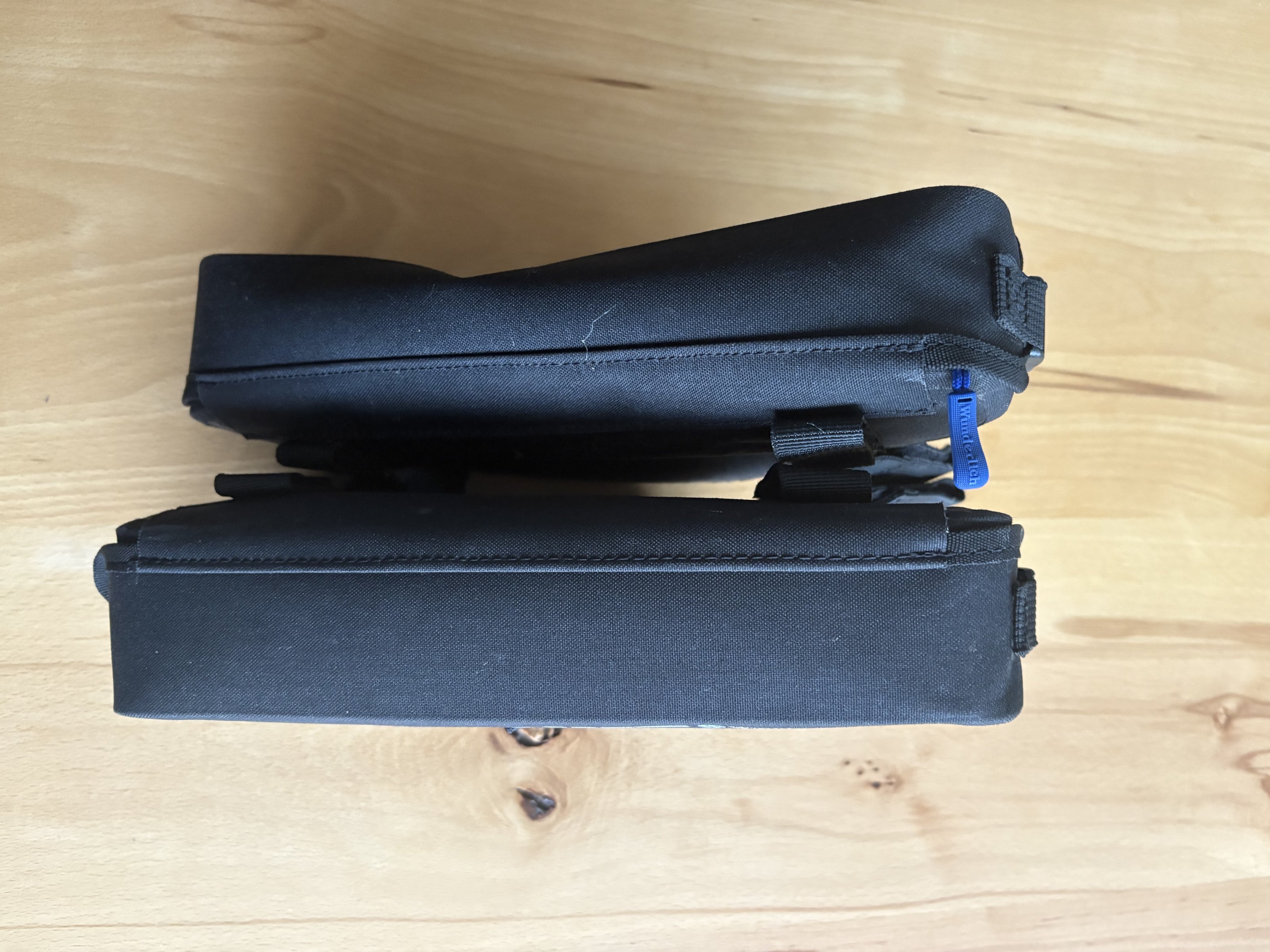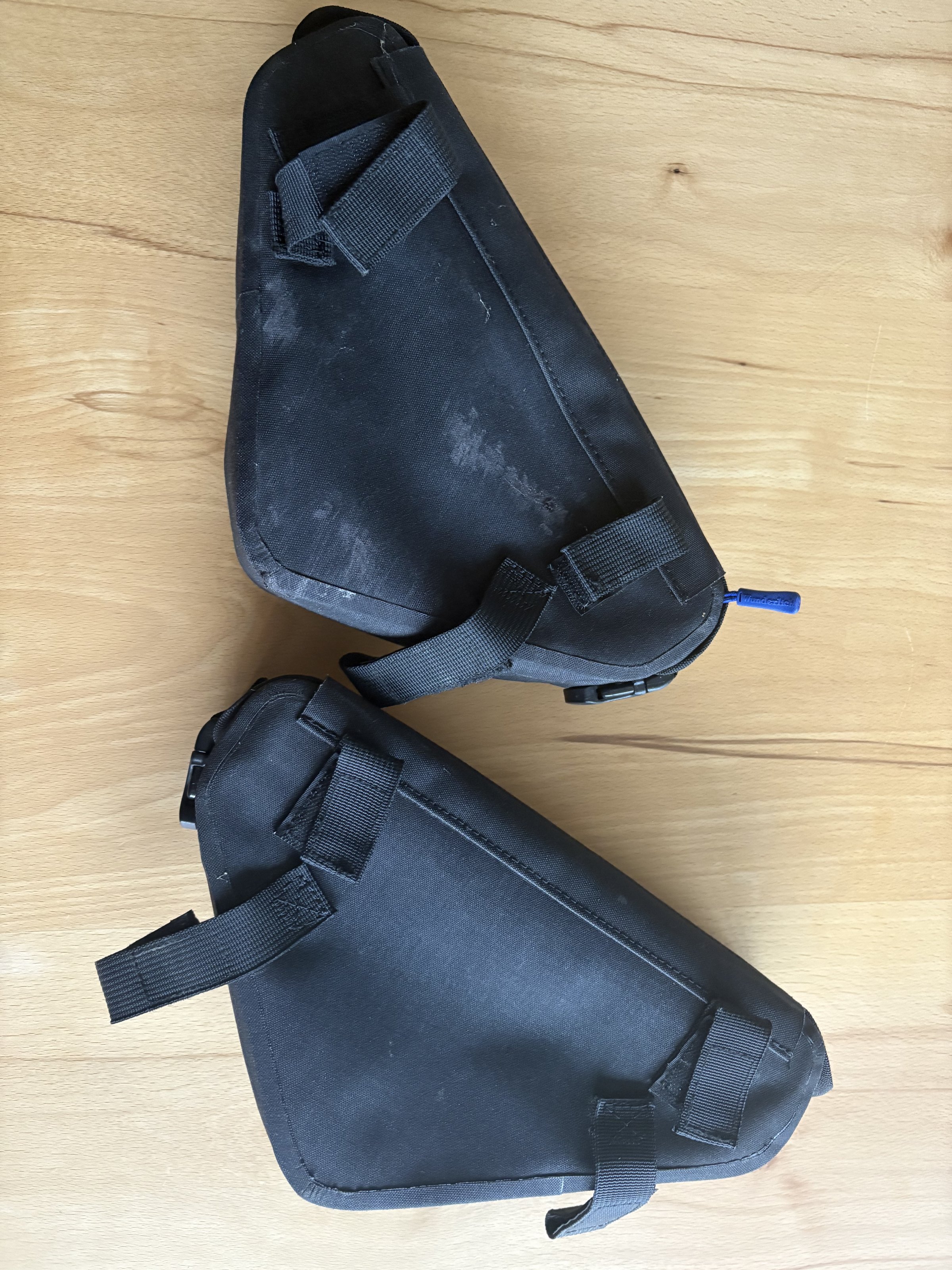 Eine ist leicht gebraucht, die andere hat eine kleine „dünne“Stelle (Bild). Reißverschluss läuft einwandfrei. Diese Stelle beeinträchtigt die Funktion nicht. Auf der letzten Tour mit den Varios, blieb sie auch dicht. Kurzum für beide Taschen möchte ich 65 €, zuzüglich 5€ Versand. Ich würde mich freuen, wenn sie einen Abnehmer finden.